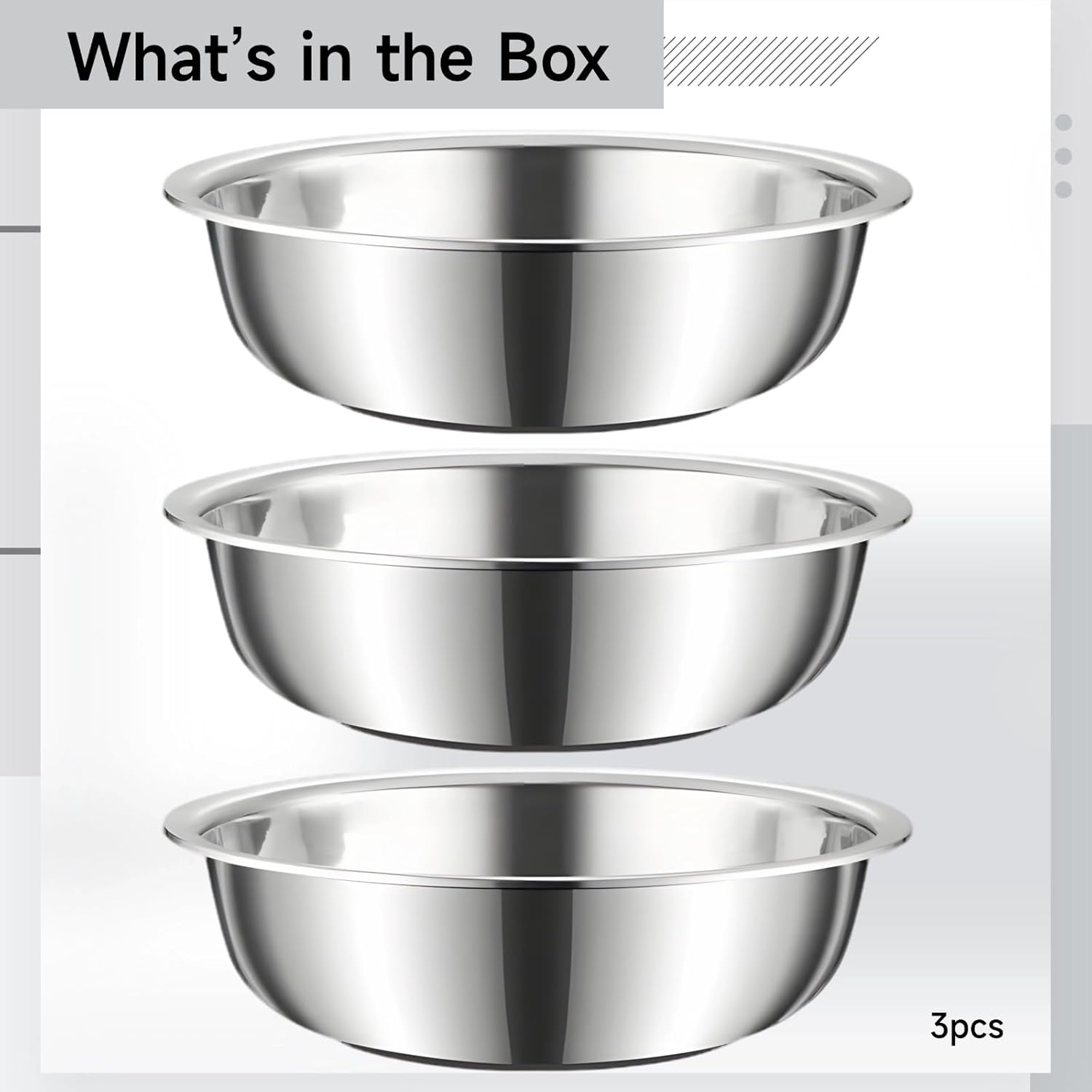 Color: Silver Material: Stainless Steel Size: Stainless Steel Bowl: 27 x 27 x 14 cm Package Includes: 3 x Four-pack Stainless Steel Bowls Note: - Please refer to the measurement. Tiny measuring error is allowable in normal range. - There might be a little color difference due to the monitor, camera or other factors, please refer to the physical item.