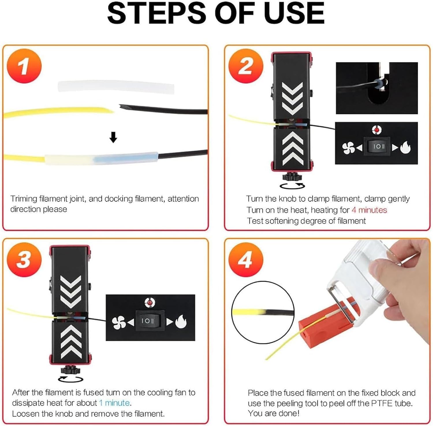 Say goodbye to wasted filament and hello to seamless multi-color 3D prints! This easy-to-use filament welder delivers sturdy connections, works with most materials, and turns every scrap into a finished project!Features:1. Durability all‑steel construction for long service life.2. 1.75mm standard size for wide compatibility.3. Adjustable clamp for precise alignment.4. Automatic shut‑off for enhanced safety.5. Fuses leftover scraps into usable filament.6. Supports custom colorful model creation.Specifications:Product Name: 3D Printer Filament Splicer WelderMaterial: MetalPower Input: 100V, 220-240VPower Output: 12V4A 48WApplicable Filament Diameter: 1.75mmApplicable Filament Type: PLA/ABS/PETG/PA/PCProduct Size: 152.5×52.35×46.5mm/6×2.1×1.8inchPackage Size: 230×180×70mm/9.1×7.1×2.75inchGross Weight: 0.56kg/1.32lbsPackage Contents:1 × Filament Welder Connector1 × Adapter1 × Filament Peeling Rack1 × Peeling Device100 × PTFE TubeNotes:1. Please allow the slight color difference caused by the shooting light and 1-3cm error due to manual measurement.2. If you have any questions please contact me and I will reply you within 24 hours.