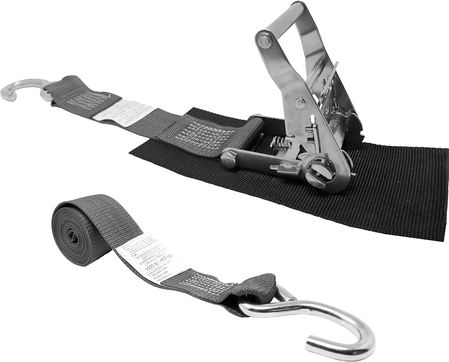 2 Inch Ratchet Strap, Stainless Ratchet With Short Wide Handle, Protective Pad Under Buckle, Stainless Steel S Hook On Each End, Fixed End Strap 1 Ft, Adjustable Strap 9 Ft, Total Strap Length 10 Ft, Polyester Tie-down Webbing, Assembled In The USA.