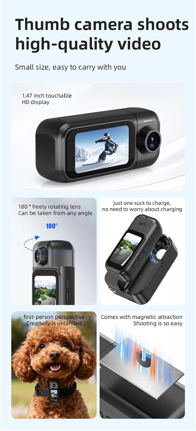 Product Name: Thumb Camera Video resolution: 4K 3840 * 2160/1080P 1920 * 1080 Video format: MOV format Frame rate: 30fps Storage temperature: -10 to 60 degrees Celsius Operating temperature: -10 to 60 degrees Celsius Memory card: TF card supporting up to 256GB Interface type: Type-C interface Charging voltage: 5V/2A Product dimensions: 67 × 28.5 × 20.8 mm Charging compartment dimensions: 71.5 × 48 × 23.5 mm Battery life: Camera battery life: approximately 3 hours Includes charging pod, extending battery life to approximately 8 hours The standards include: 1 * POV camera 1 * with clamp base 1 * helmet mount 1 * framework 1 * waterproof box 1 * magnetic lanyard 1 * data cable 1 * bicycle stand 1 * 32G/64G/128G/256G memory card 1 * user manual 1 * magnetic suction charging chamber Note: Colors may vary slightly due to lighting and screen differences Please allow minor measurement deviations; ensure you're comfortable with this before ordering We care! If you're not satisfied for any reason, please reach out to us. We're committed to providing excellent customer service