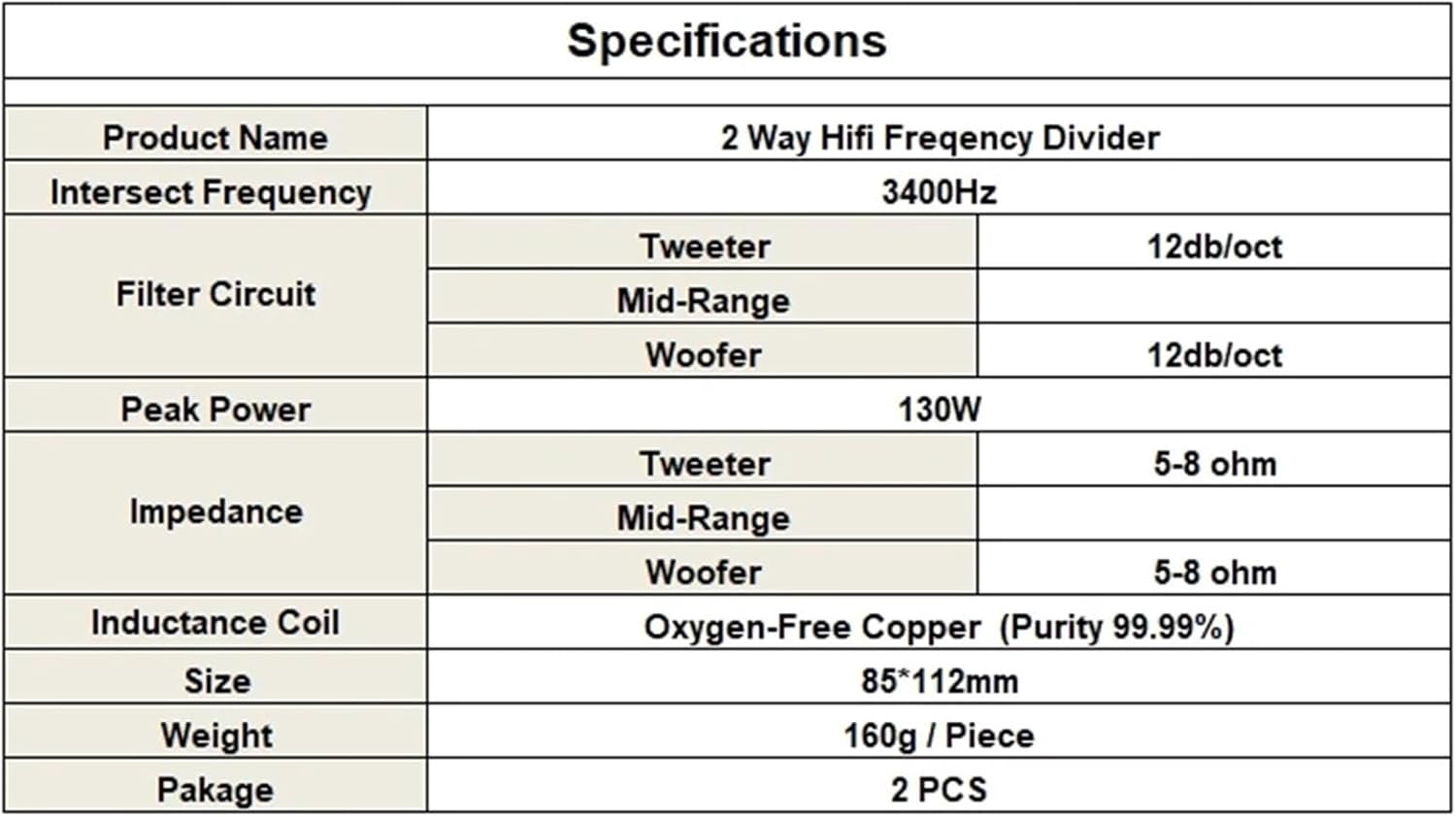 Frequency DividersSpecificationsProduct Name: 2 Way Frequency DividerIntersect Frequency: 3400Hz Filter Circiut: Treble(12db / oct)Bass(12db / oct)Impedance: 5-8 ohmPeak Power: 130WSize: 85 * 112mmWeight:160g/PiecePackage Included:2PCS Frequency Dividers