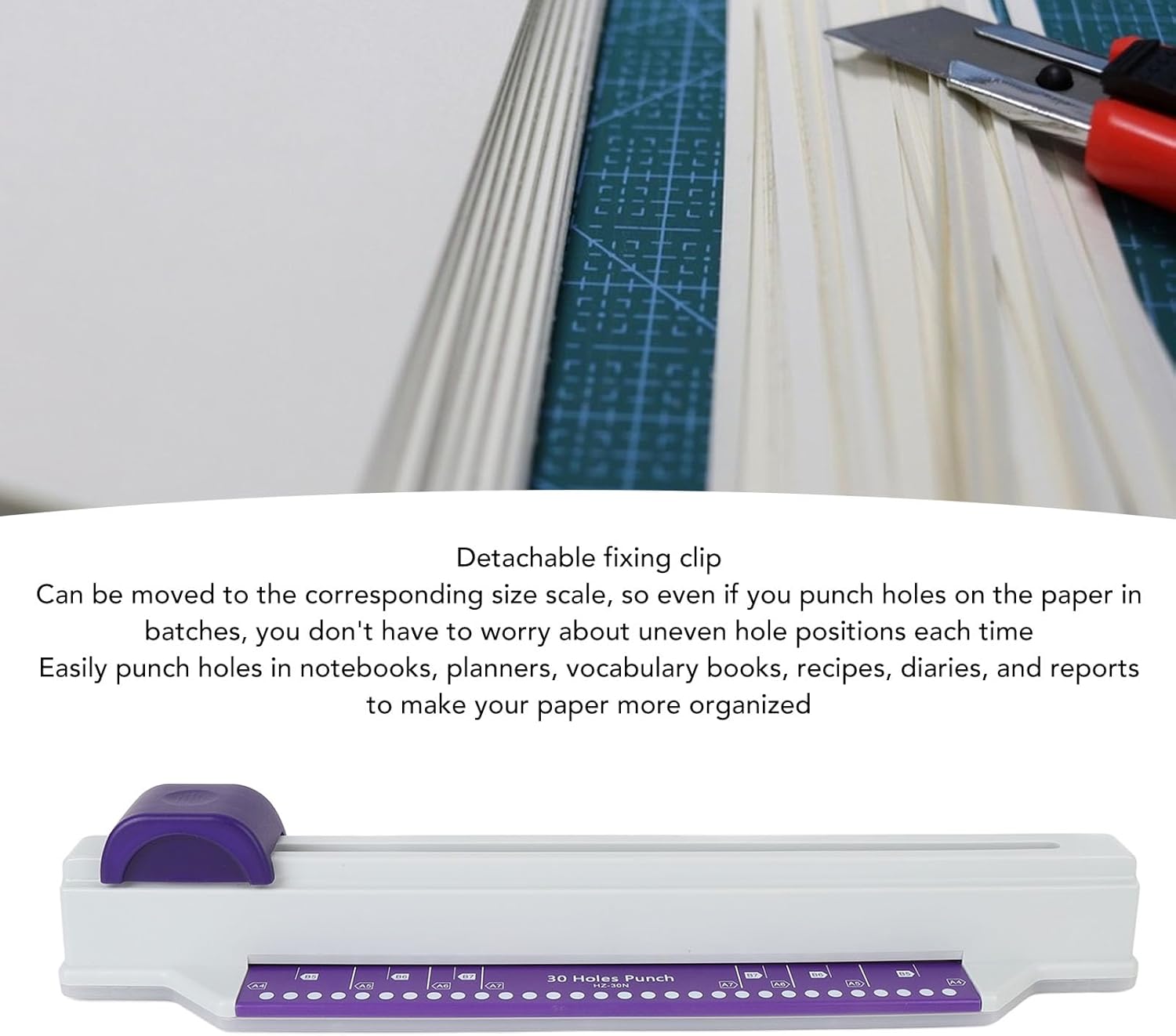 1. [30 Hole Punch] This hand push hole punch allows you to effortlessly punch 30 holes at once, handling up to 6 sheets of paper at the same time. 2. [4 Binding Spines] The 30 hole puncher comes with 4 binding spines. random in color, with 2/5in (10mm) hole, can hold up to 80 sheets of paper. 3. [Detachable Fixing Clamp] The hand push book binding is equipped with a detachable fixing clamp that can be moved to the corresponding scale, so you do not have to worry about the uneven position of each hole when punching in batches on the paper. 4. [Multi Purpose Book Bin der] Use the desktop binding punch for various projects, from scrapbooking to organizing office documents, making it easy to keep your notebooks, planners, and reports neat and orderly. 5. [Keep Paper Organized] Desktop binding punch is easily punch holes in notebooks, planners, vocabulary books, recipes, diaries, and reports to make your paper more organized. Specification: Item Type: Punch and Binding Machine Material: Plastic Binding Spine Color: Random Weight: Approx. 1390.00g / 49.03oz How to Use: Direct use. PackageList: 1 x Bin der Hole Puncher 4 x Binding Spines (Random Color) 3 x Accessories