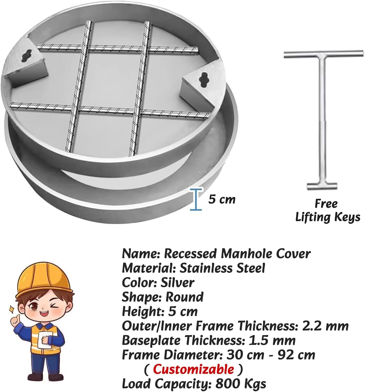Are you tired of manholes disrupting the aesthetic appeal of your surroundings? Our recessed manhole covers are the perfect solution! Designed to seamlessly integrate with various surfaces, these covers can be filled with the same material as the surrounding area, whether it‘s concrete, tiles, stone, mortar, bricks, or resin. **Product Details:** - **Product Name:** Recessed Manhole Cover - **Material:** 304 Stainless Steel - **Color:** Silver - **Shape:** Round - **Frame Diameter:** Customizable from 30 cm to 92 cm - **Height:** 5 cm - **Outer/Inner Frame Thickness:** 2.2 mm - **Base Plate Thickness:** 1.5 mm - **Load Capacity:** 800 kg **Choosing the Right Size:** To determine the correct size for your manhole cover, simply add 6 cm to the diameter of the manhole. **Key Features:** - Our invisible manhole cover blends perfectly into any environment, enhancing the visual appeal of your space. - Designed for both pedestrian and electric vehicle traffic, it provides a safe, uninterrupted passage. - Made from stainless steel, this cover is odor-resistant and can withstand significant weight, ensuring long-lasting durability. - Equipped with lifting holes for easy removal, the cover remains discreet when not in use. - Versatile enough for various applications, including yards, residential areas, gardens, schools, sidewalks, and commercial streets. **Installation Instructions:** 1. Position the outer frame of the cover in the groove of the manhole. 2. Insert the inner frame into the outer frame. 3. Apply a layer of cement mortar at the bottom of the inner frame. 4. Cover the inner frame with the same flooring material for a flawless finish. 5. Complete the installation for a visually appealing result. **Package Includes:** - 1 x Manhole Cover - 1 x Frame - 1 x Lifting Key Choose our recessed manhole covers to maintain the beauty of your environment while ensuring practicality and safety. Perfect for both residential and commercial use, these co