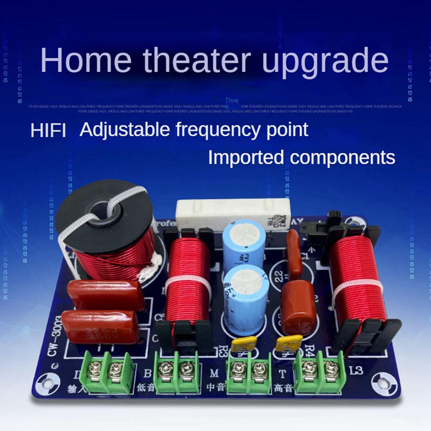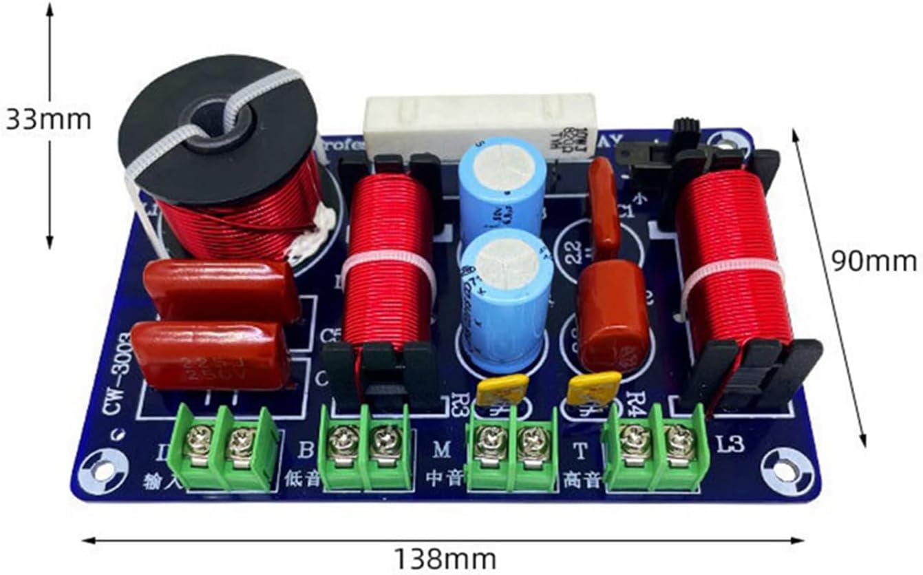 Sprressal Filter: 1 high 1 medium 1 low (three-way)Power: 250WImpedance: 4-8 ohmsCrossover point: /midrange 850Hz, treble/medium 2 ways, 5200Hz-5500Hz switch adjustableDue to different batches of raw materials, the electronic components on the product may have color differences or differences, which does not affect use.Colour: Photo ColorMaterial: PCB+electronic componentsPackage Contents:4 x 3 Way CrossoverOnly the above package content, other products are not included.Note: Light reflection and different displays may cause the color of the item in the picture a little different from the real thing. The measurement allowed error is +/- 1-3cm.