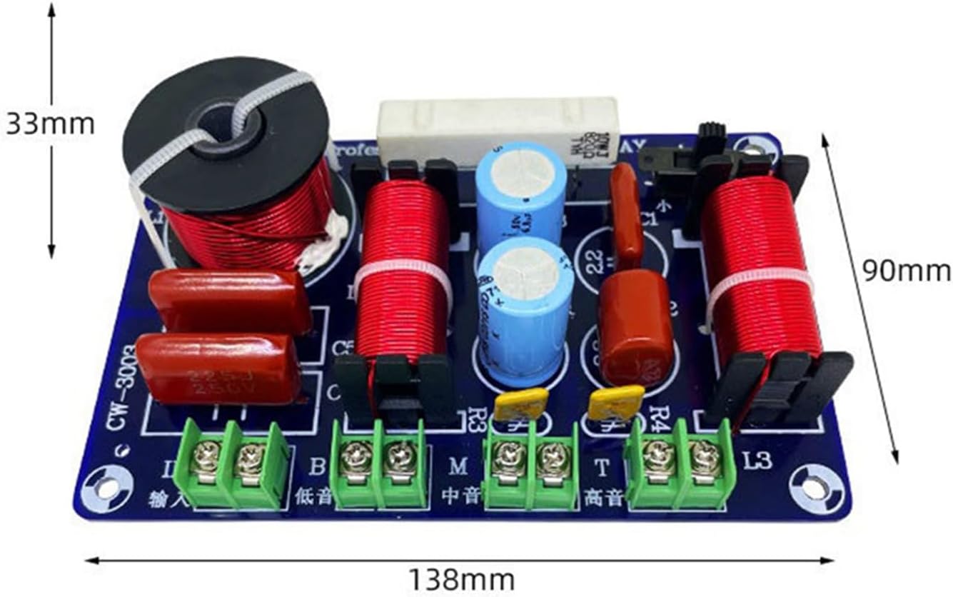Cwmiibili Filter: 1 high 1 medium 1 low (three-way)Power: 250WImpedance: 4-8 ohmsCrossover point: /midrange 850Hz, treble/medium 2 ways, 5200Hz-5500Hz switch adjustableDue to different batches of raw materials, the electronic components on the product may have color differences or differences, which does not affect use.Colour:Photo ColorMaterial:PCB+electronic componentsPackage Contents:6 x 3 Way CrossoverOnly the above package content, other products are not included.Note: Light reflection and different displays may cause the color of the item in the picture a little different from the real thing. The measurement allowed error is +/- 1-3cm.