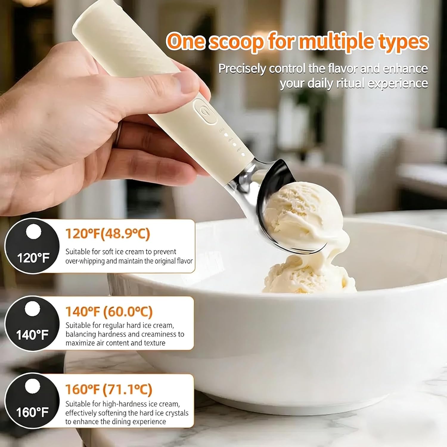 Say goodbye to the frustration of struggling with rock-hard frozen desserts! This electric self-heating ice cream scoop takes the effort out of serving ice cream, making every scoop smooth and effortless. Featuring a stainless steel head and three precise temperature settings, this innovative kitchen tool is designed to handle any type of frozen treat with ease. Choose 120°F for soft ice cream to preserve its original flavor and texture, 140°F for regular hard ice cream to balance hardness and creaminess, or 160°F for high-hardness ice cream to effectively soften stubborn ice crystals. Simply press the power button, select your desired heat level using the LED indicator lights, and let the scoop do the work. The ergonomic handle provides a comfortable, non-slip grip, while the polished stainless steel bowl glides through even the densest frozen desserts. Available in four stylish colors — cream, blue, brown, and black — this heated scoop makes a wonderful addition to any kitchen and a thoughtful gift for dessert lovers. Elevate your ice cream experience with perfectly scooped, beautifully rounded servings every time.