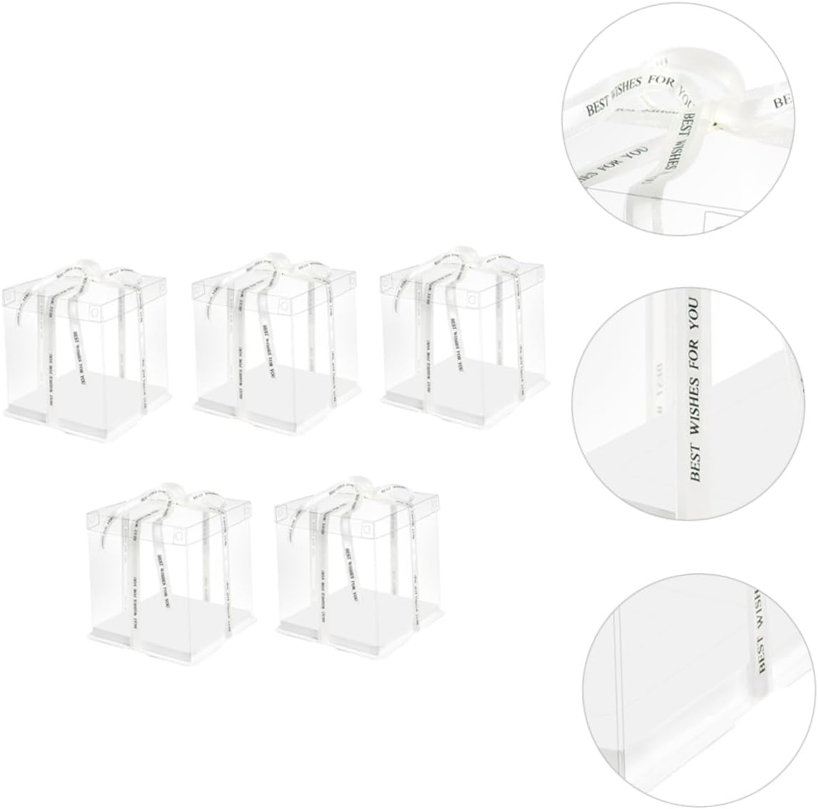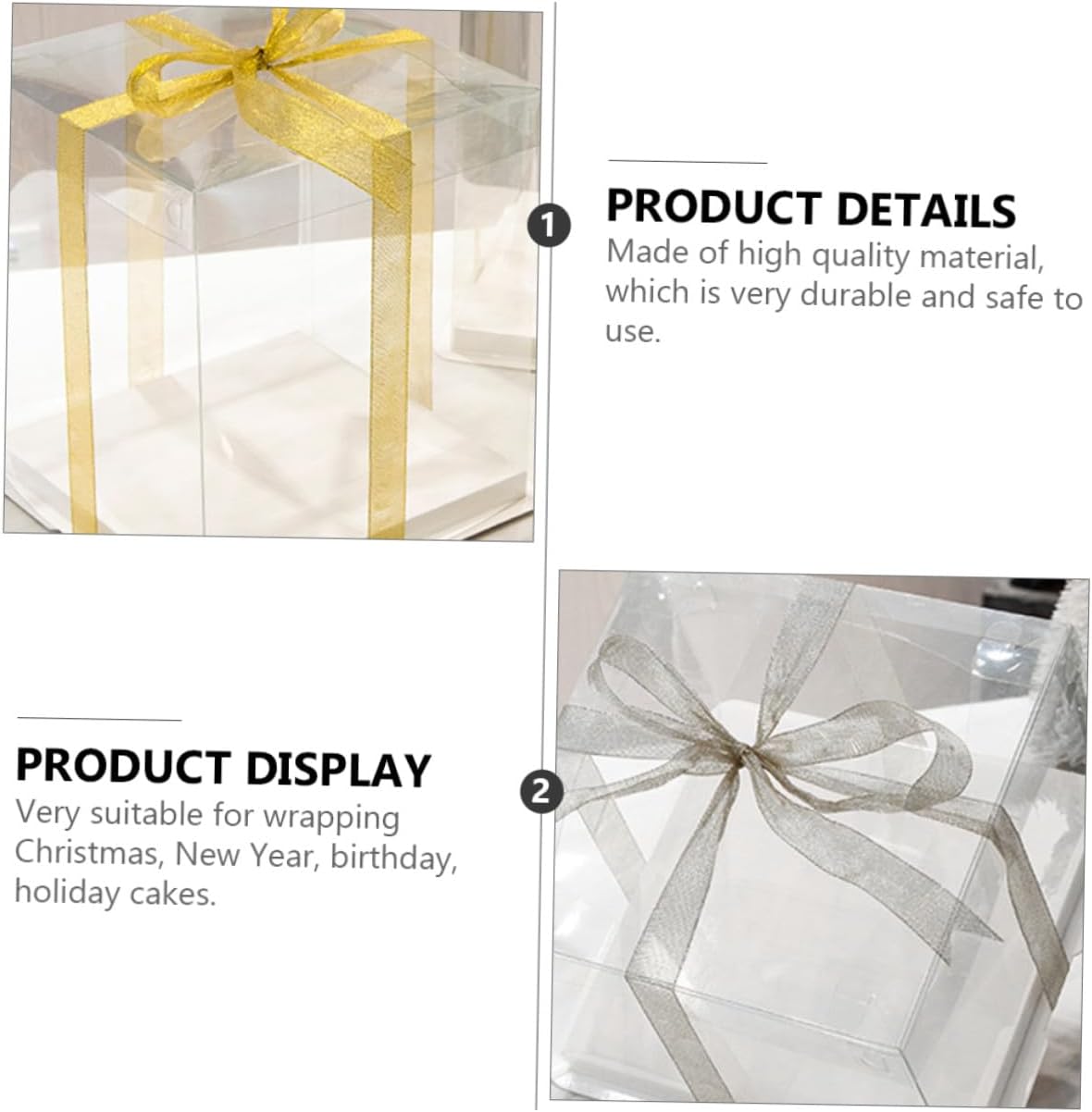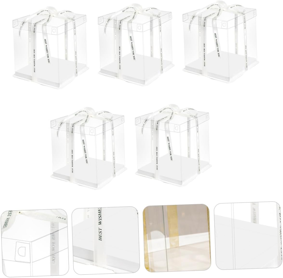 Package List 5 x cake packaging boxes Characteristics -Product Info:Birthday Cake Box - Applicable: for 8 inch cake Square Storage Container. - Color: White ( color for ribbon). - Material: Food grade white card, PET. - Size: 26.00X26.00X18.00cm/10.22X10.22X7.07inch. - , environmental protection, safe and . - Transparent design can show off your cakes inside without exposing to the air Food Packaging Boxes. - Simple and practical design, and easy to use and carry Cake Container. - They can be used for shower, birthday party or other party Cake Storage Container. - Featuring reusable, it can be used for times and easy to clean Cake Carrier.Goods DescriptionCake Holder Sealing design can prevent leakage effectively.Food Packaging Boxes This is a practical cake box.Cake Storage Container This cake box can help you to pack your cakes and transparent design allows you see the cake directly.Cake Carrier With the ribbon handheld design, this cake box is very convenient to carry.Cake Packing Case Environmentally friendly material, safe and to use
