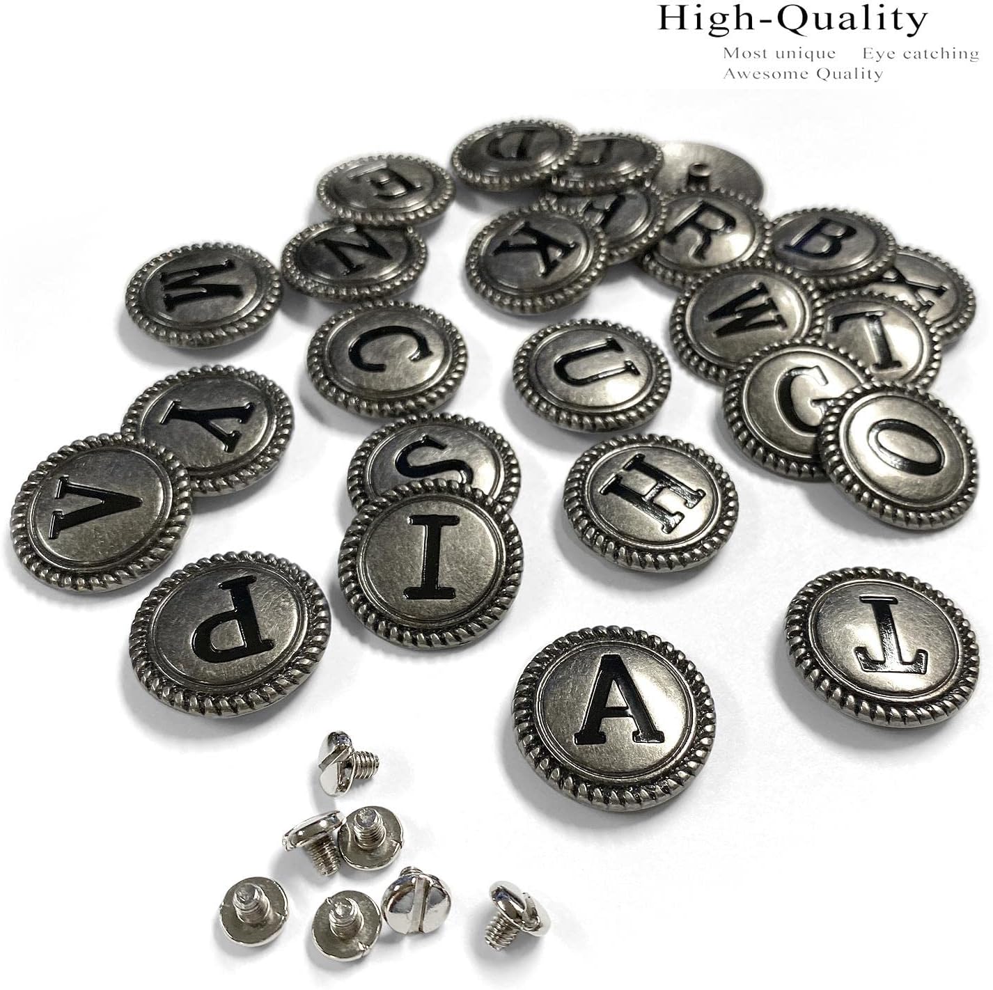*High-quality hand-polished conchos. Alphabet letter initial conchos size 1-1/8".*Conchos material: Zinc and antique silver color finish.*Screws back conchos include 3/16" long chicago screws.*Personalize your belt, guitar strap, horse tack, or other projects.