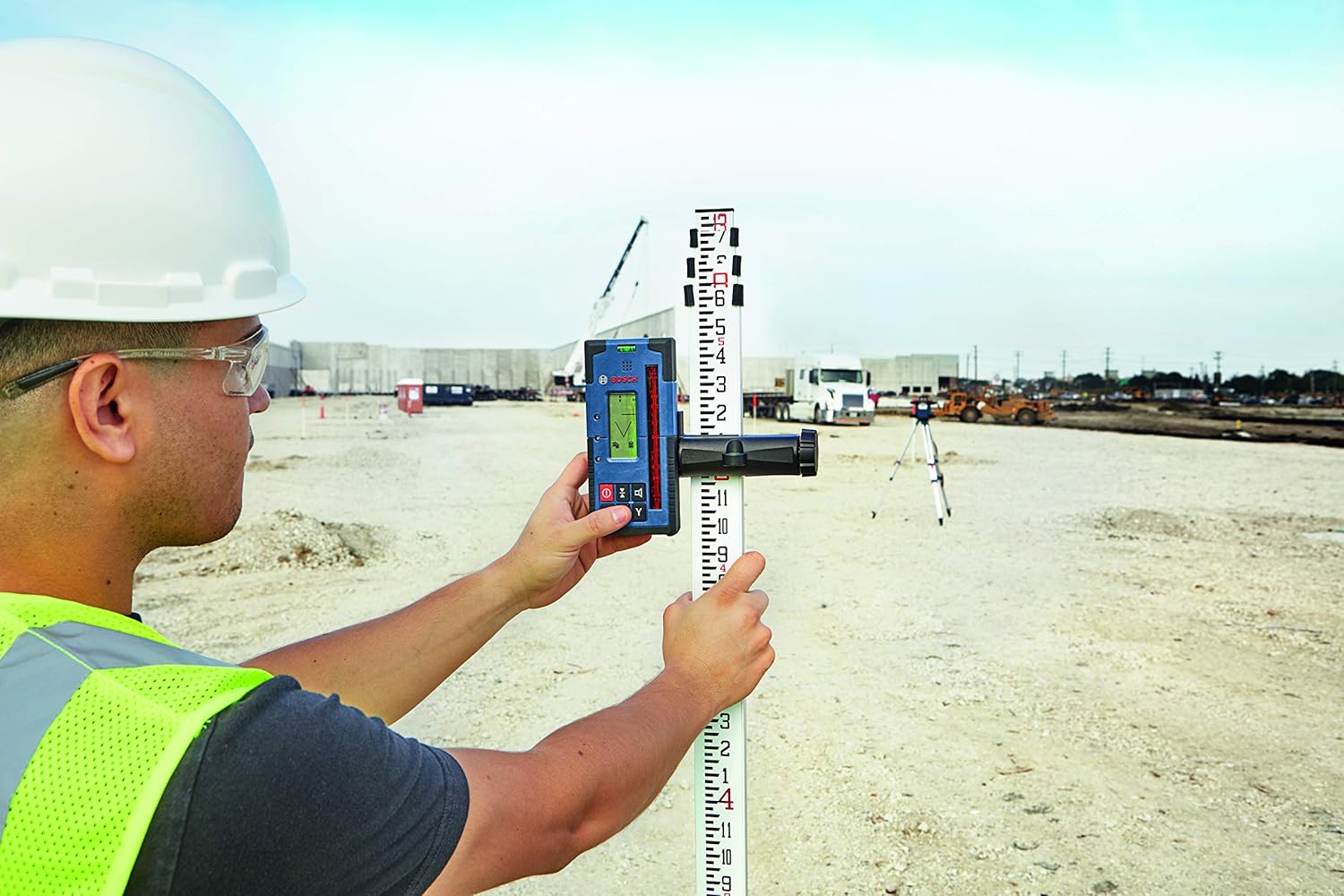 The 18V REVOLVE4000 Connected Self-Leveling Horizontal/Vertical Rotary Laser Kit with uCAL User-calibration delivers a comprehensive solution for precise outdoor and indoor leveling. It has a Dual Dial-In Slope feature that allows slope angle adjustment on both the X and Y axes, for grading applications. The rotary laser features an alkaline adapter that required 4 d-cell batteries for use. The REVOLVE4000 is engineered with a cage overmold and an innovative handle design, and it is built to IP68 dust- and water-protection standards. It features Bluetooth® connectivity to a connected device, linking to the Bosch Leveling Remote App. This app controls on/off, Dual Dial-In Slope, and more. The rotary laser features uCAL, for user-calibration, taking the user step by step through the calibration process. This avoids tool down time and provides confidence that the laser is accurate. It delivers accuracy of up to +/-1/16 inch at 100 feet in horizontal applications and +/-1/8 inch at 100 feet in vertical mode, and a range of up to 4,000 feet with laser receiver. The laser features a vertical beam at 90 degree point for layout, squaring and plumb applications. The comprehensive kit includes a remote control, alkaline battery adapter, 4 d-cell batteries, wall mount, laser receiver, aluminum tripod, sturdy grade rod and durable hard carrying case.