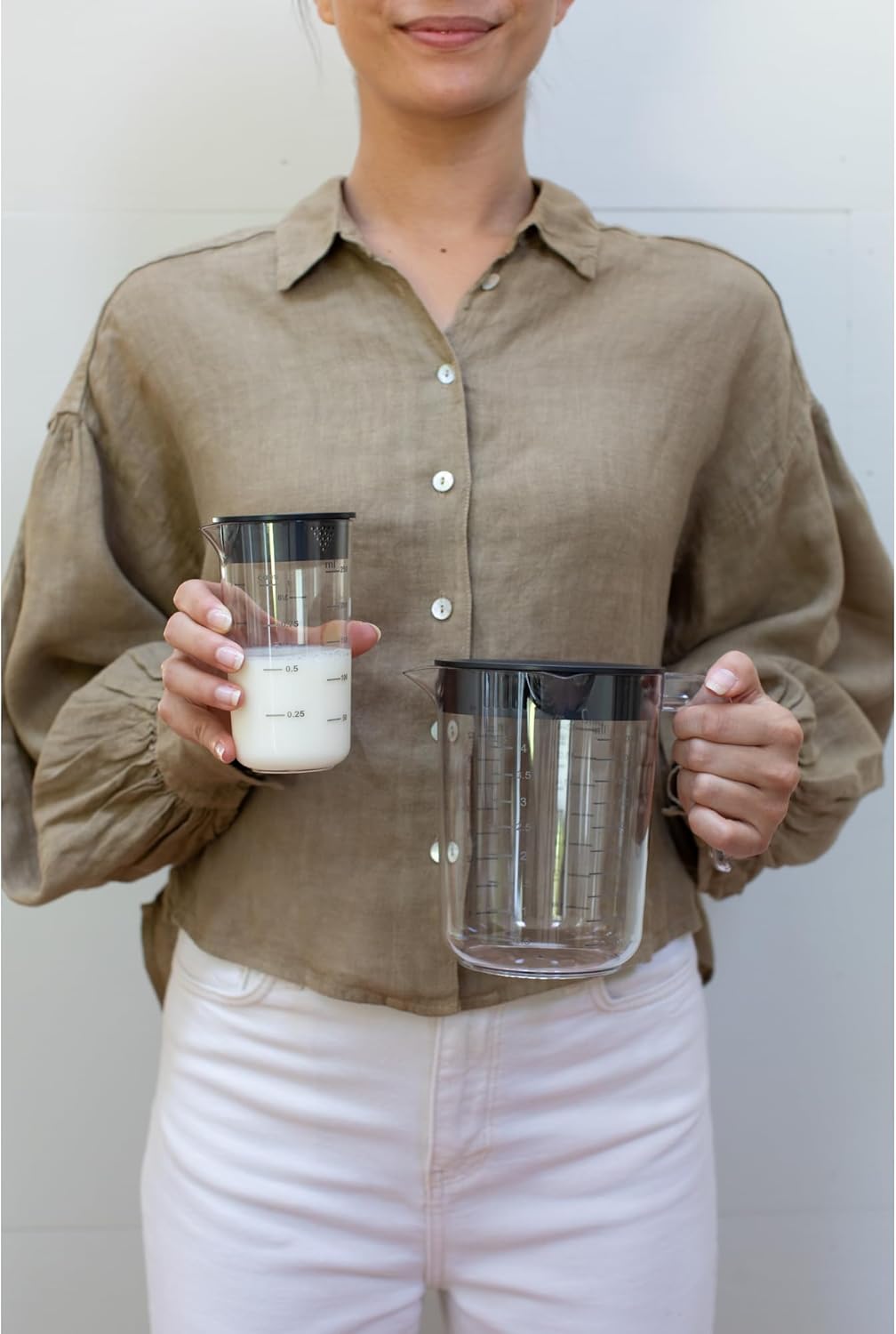 Simplify cooking and baking with the Brabantia TASTY+ Measuring Jug Set. This 2-piece set includes 8.5 fl oz and 33.8 fl oz BPA-free jugs that nest together to save space. Clear markings ensure accurate measurements in ml, oz, cups and pints, while dual spouts offer drip-free pouring. The smart lid can rest open or close tight for storage. Built from recyclable plastic and made to last, this set is essential for anyone who loves precision in the kitchen.