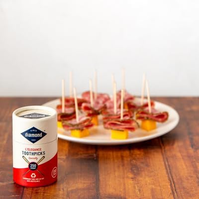 Diamond L’Elegance Toothpicks are designer toothpicks complete with decorative notches that make picking them up easy and fast. VERSATILE & STURDY: These solid wood multipurpose toothpicks are sturdy enough for teeth cleaning and long enough to use as skewers for appetizers, fruits, sandwiches, cheeses, and other finger foods. APPEALING SIMPLICITY: These wooden toothpicks are all-natural, biodegradable & compostable. They’re ideal for everyday use or for perfecting an appetizer spread, featuring an elegant carved detail. CLEAN & GREEN: Each toothpick was created with durable, sturdy wood. Nearly all the materials in our products are made from renewable resources so you can be sure that your choice is a clean one. CONVENIENT STORAGE: These toothpicks come in a 100% recyclable tube that makes them easy and safe to store and transport so they’re there whenever you need them. TOOTHPICKS FOR EVERY OCCASION: From flat to frilled, swords, forks, parasols, and more, serving in style is always easy with our wide collection of whimsical and functional toothpicks for any occasion.