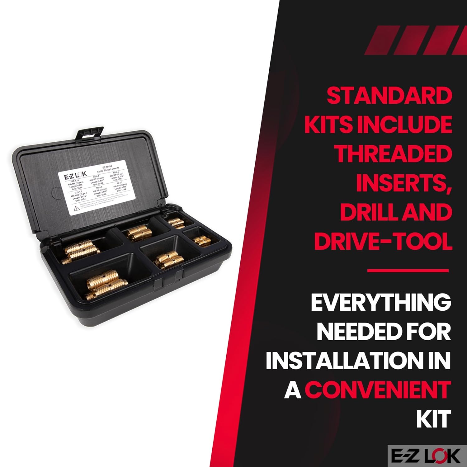 E-Z Knife Threaded Inserts Assortment Kit for HardwoodThese thread inserts for hard-wood are ideal for applications where stripping or thread erosion is possible. Perfect for furniture, cabinetry, display cases, and beer tap handles, and anywhere a fastener will be used in wood. E-Z Knife thread wood inserts provide superior holding power using a proprietary external “knife” thread to slice into the wood. They are designed for use in hard woods such as oak, cherry, and maple. Standard kits include 60 threaded inserts, drill, and drive-tool.Threaded Insert Assortment Kit Includes: 10 pieces each: M3-0.5 (0.375" long), M4-0.7 (0.375" long), M5-0.8 (0.500" long), M6-1.0 (0.500" long), M8-1.25 (0.625" long), M10-1.5 (0.625" long).InstallationE-Z Knife threaded inserts are typically installed with the slots up. The slots accommodate a screwdriver or E-Z LOK drive tool. For harder woods, screwdriver installation isn't practical. Installation can be accomplished with the drive tool or using a bolt and jam nuts. When using the bolt/jam nuts installation technique, the slotted end of the insert can be either up or down.