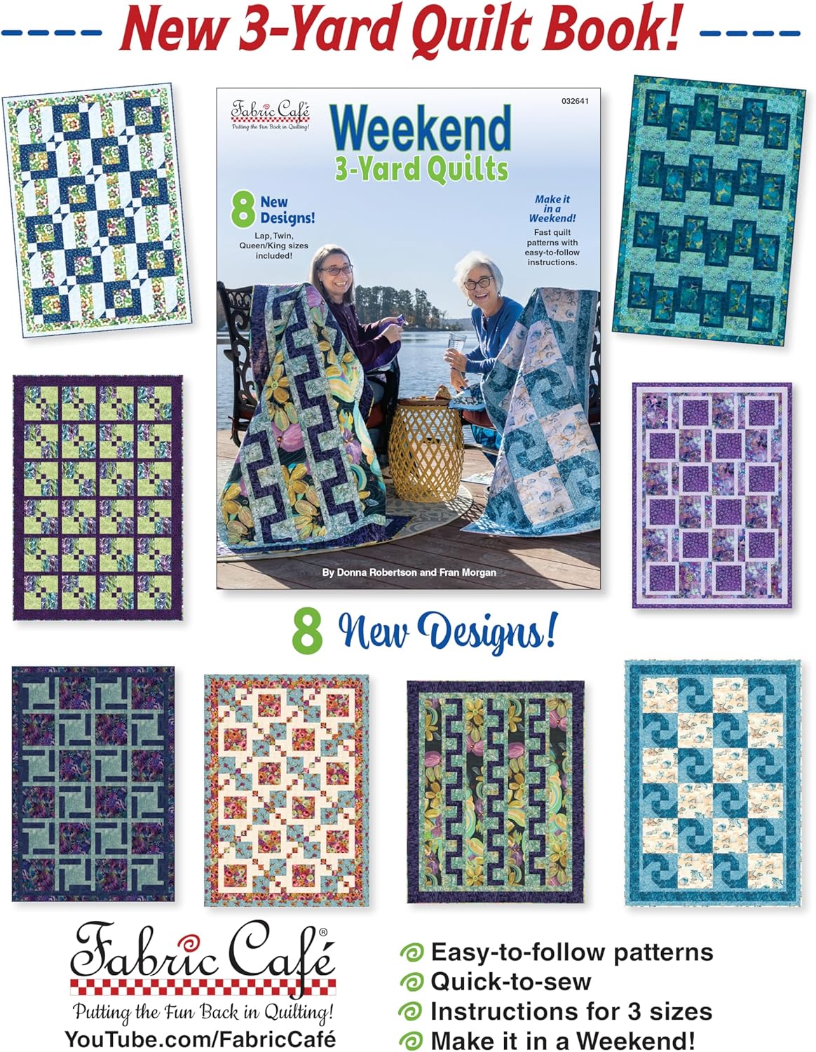 Weekend 3-Yard Quilts by Fabric Café features eight fast, beginner-friendly quilt patterns designed to help you complete a quilt top in a weekend.Each pattern uses three one-yard cuts of coordinating fabric to create a lap-size quilt, with enlargement instructions included for Twin and Queen/King sizes.These quick quilt patterns focus on minimal seam matching and streamlined construction so you can spend less time aligning seams and more time sewing. Time-saving methods like strip piecing and stitch-and-flip construction help each quilt come together quickly while still delivering bold, dynamic designs.No half-square triangles: All eight patterns are designed without half-square triangles (no HST), making this collection especially approachable for new quilters.Patterns included:DaybreakGame TimeLakesideRambleRoad TripSea BreezeSunday PicnicWanderlustWhether you are making a gift, decorating your home, or sewing for charity, Weekend 3-Yard Quilts helps you start on Friday and admire your finished quilt by Sunday.