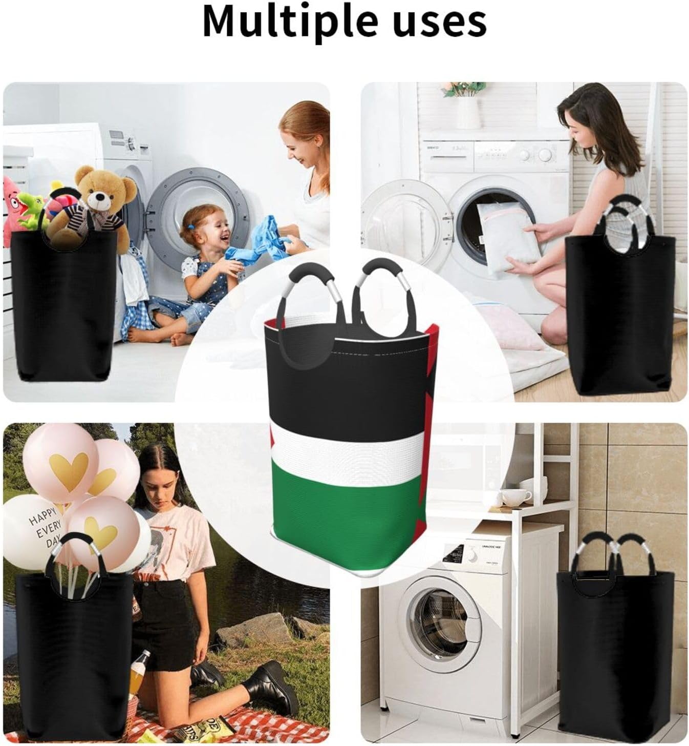 Our Flag of the State of Palestine dirty clothes storage bag is made of polyester, which is lightweight and flexible. It can maintain a stable shape even under heavy pressure and collision. At the same time, the incorporation of Oxford cloth material significantly improves the durability of the product, and it is resistant to wear, bumps and pulling. The storage bag is designed with a large capacity, which can easily carry winter clothes, daily clothes and a variety of sundries. It is easy to carry and store, and fits tightly into the gap of the suitcase after folding. The aluminum handle is sturdy and reliable, supports hanging, and is suitable for a variety of places. In terms of design, it adopts leak-proof technology, combined with waterproof coating and precision sewing, which is effectively waterproof. The exterior uses cutting-edge transfer technology, and a PE board support is added at the bottom to ensure stable load-bearing and prevent tipping. This storage bag is practical and easy to use, and is an ideal choice for travel and home.