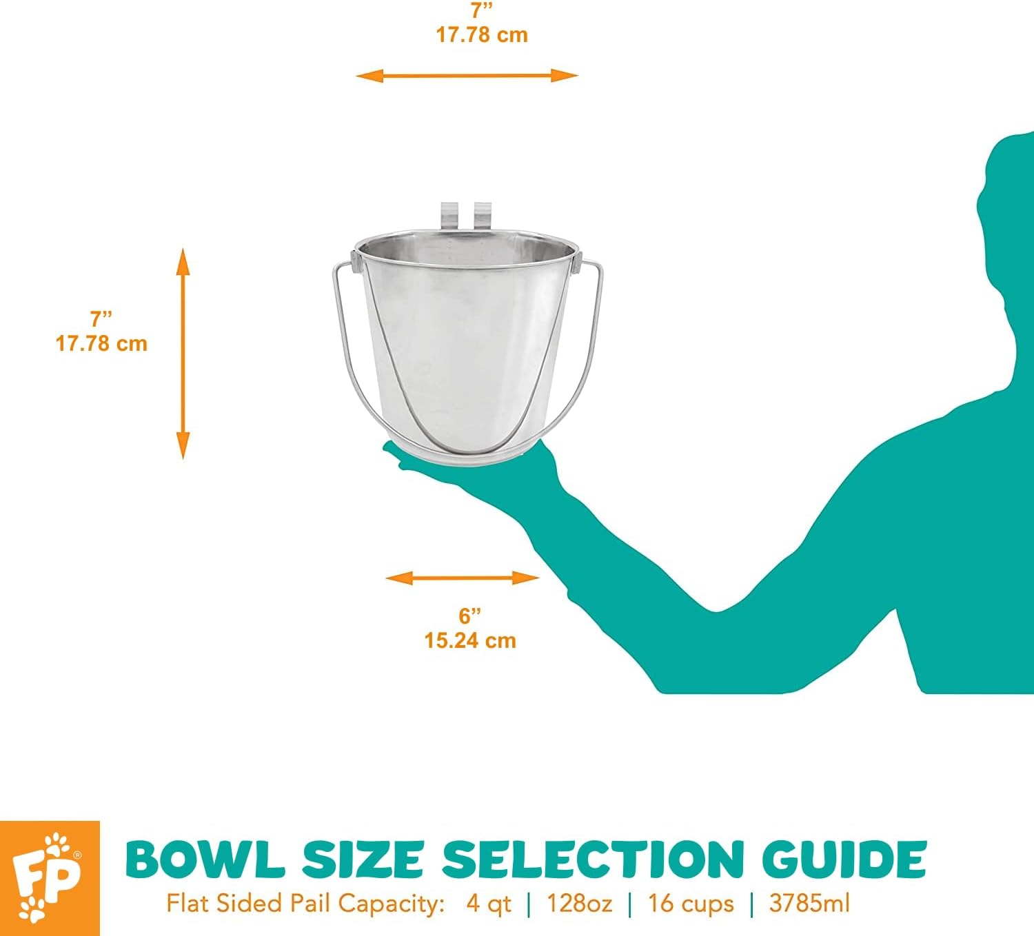 Finally, A Kennel & Cage Accessory for All Creatures, Big & Small! The Fuzzy Puppy Pet Products ® Heavy-Duty Flat Sided Pail with Hook is one of the cage accessories you've been missing! Our pails range from extra-large to extra small to fit into your pet feeding system. The large sizes of our Heavy-Duty Pail are perfect for use in dog kennels to feed multiple animals at once, to tend to livestock and are also great to use as a milk bucket for cows and goats. The smaller Heavy-Duty Pails are also great for hooking inside cages for your critters, too. The 1 pint pails fit perfectly in cages for ferrets, guinea pigs, hamsters, bunnies, rats and more! The stainless-steel design resists rust, scratches, breakage and is also dishwasher safe. This dish a must have that your pet will love to use! Comes in a variety of sizes for all your needs: 1 pint, 1 quart, 4 quart, 6 quart, 9 quart TRULY A TIME SAVER The contoured handle makes carrying heavy loads much easier. Whether you're carrying your pet's food, a full bucket after milking or water for your livestock, you know you can take fewer trips with our buckets. For outdoor users, they’re super easy to lift off and bring inside at night to keep water from freezing and remove temptation from unwanted visitors. Not to mention, the versatility makes them easy to bring in and clean at night! Product Details: • 100% Stainless-Steel • Convenient • Hygienic • Diswasher Safe • Welded Brackets • Heavy Duty Hanging Hooks