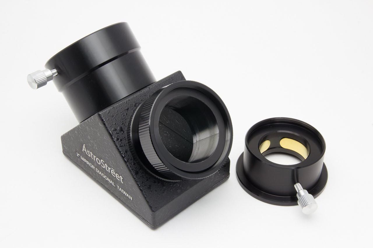 Taiwan GSO 2 Inch Zenith Mirror for SCT Taiwan GS company is a very famous OEM manufacturer that continues to supply the highest quality parts to the world's top brand telescope manufacturer. Made in Taiwan, high cost performance 2 inch zenith mirror A virtually robust model with a high performance mirror. In addition to the metalized body, the eyepiece uses a brass ring tightening type. Includes a 1.2 inch (31.7 mm) adapter and a filter screw 2 inch 90 degree zenith mirror Mirror: 1/10 wave accuracy (Al + SiO2 coatings, reflectivity 92%) SCT thread connection, with 31.7mm conversion adapter (with filter thread) Total Length: Approx. 3.7 inches (95 mm) (L) x Approx. 3.5 inches (90 mm) (H) x Approx. 2.6 inches (65 mm) (D) Weight: Approx. 20.9 oz (580 g). Madein Taiwan The above data is the manufacturer's catalog value