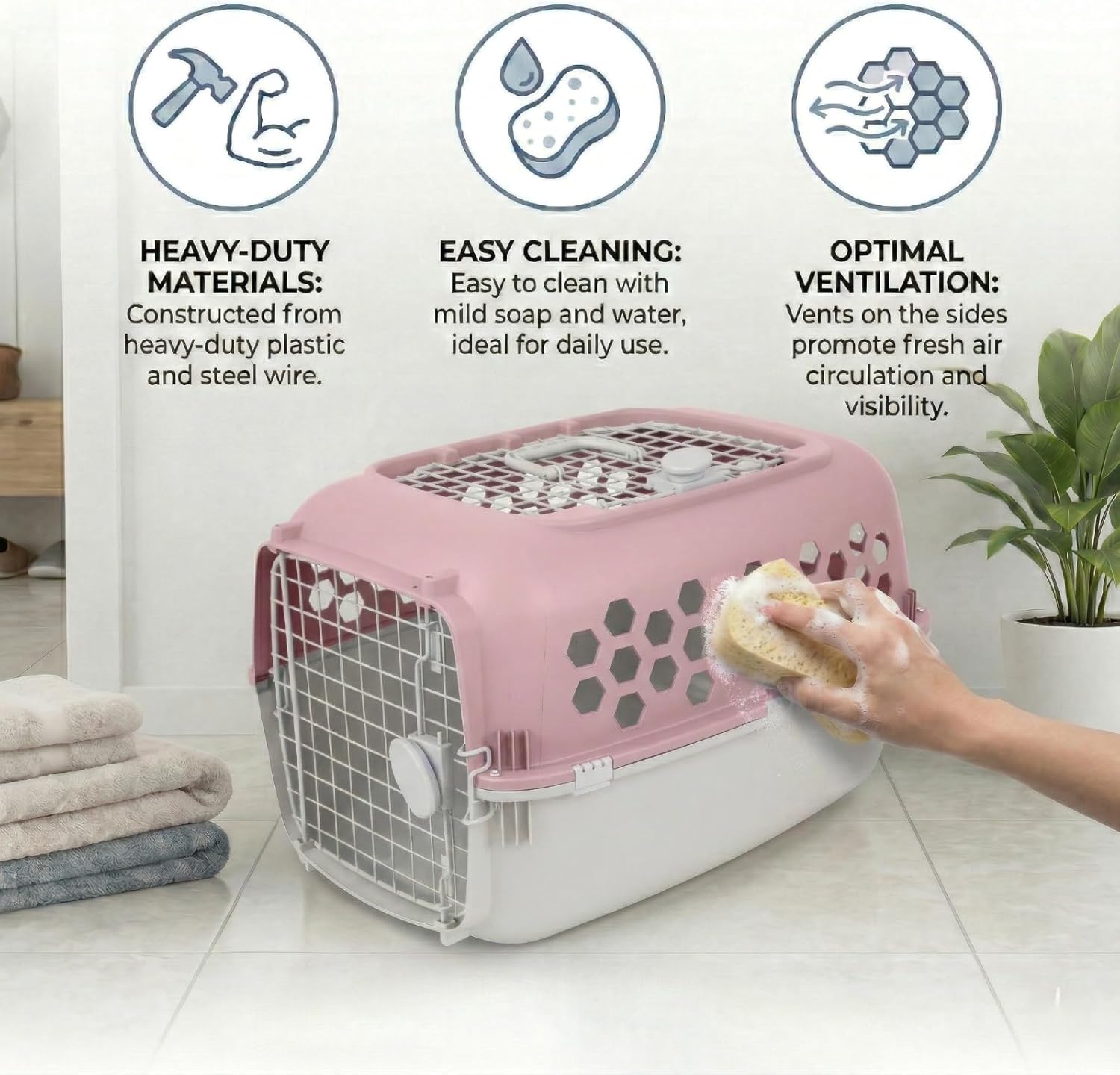 Make traveling with your pet a calm, secure, and comfortable experience with this 24-Inch Hard-Sided Pet Carrier. Designed specifically to eliminate the common frustrations of pet transport, this heavy-duty plastic kennel focuses on durability and ease of use.The standout feature of this travel crate is its innovative double-door access. Alongside the traditional steel wire front door, it features a highly convenient top-loading entryway. If you have ever struggled to get an anxious cat or a squirming puppy into a carrier, this top door allows you to gently lower them inside, drastically reducing stress for both of you before a car ride or vet appointment.Key Features for Peace of Mind:Robust Capacity: The heavy-duty plastic shell and sturdy top handle are engineered to safely carry pets weighing up to 30 lbs.Exceptional Airflow: Hexagon-shaped side panels ensure continuous fresh air circulation and provide comforting visibility for your pet.Tool-Free Security: A reliable single-motion front lock and robust snap-lock side latches hold the kennel firmly together without the need for screws.Measuring 24" L x 16.5" W x 14.5" H, this spacious carrier is perfect for small to medium dogs, large cats, and rabbits. When the trip is over, maintenance is incredibly simple. The waterproof plastic easily wipes clean with mild soap and water. For ultimate convenience, the top half detaches and nests perfectly into the bottom half, allowing for compact, out-of-the-way storage. Whether you are house training a new pet or embarking on a road trip, this portable kennel delivers lasting reliability.