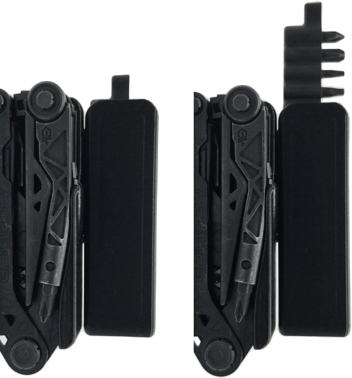HoldMyGear 3D Printed Sheath. Compatible with Gerber Center-Drive multi-tool with bit set holder. Tool clicks inside the case and holds securely. The tool can easily removed with one hand by pushing the tool up from the bottom. 1.5" belt clip can be rotated for vertical or horizontal carry. Two mounting holes allow two height adjustments with stock belt clip or can be used with many aftermarket belt or molle attachment systems. Made with durable thermoplastic. Tool not included.