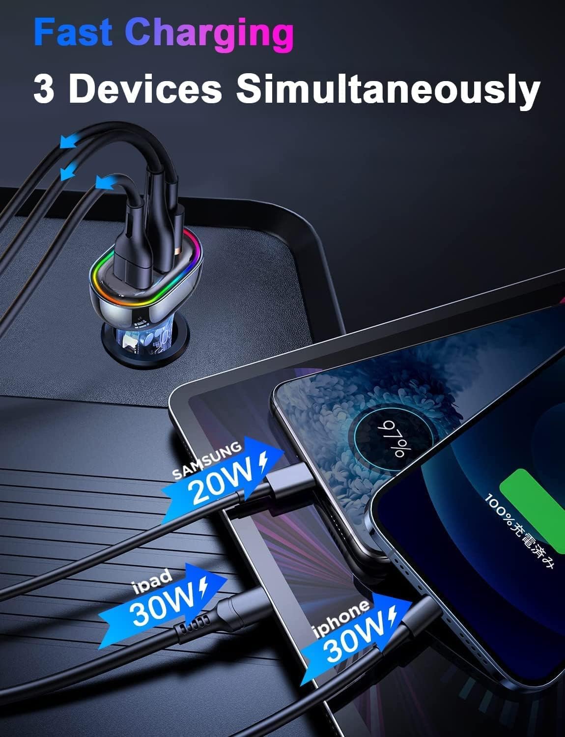 🚀【80W Super Fast Charge Car Charger】2023 Upgraded8X faster than 2.4A car charger adapter, IDOLCO 80W cigarette lighter usb charger come with Type C1(30W Max) & Type C2(20W Max) & USB A(30W Max) 3-Ports, can super fast charging multi devices(iPhone,iPad,Samsung,Google,Xperia,Android)simultaneously with built-in intelligent chip. Just enjoy the fast charging experience !