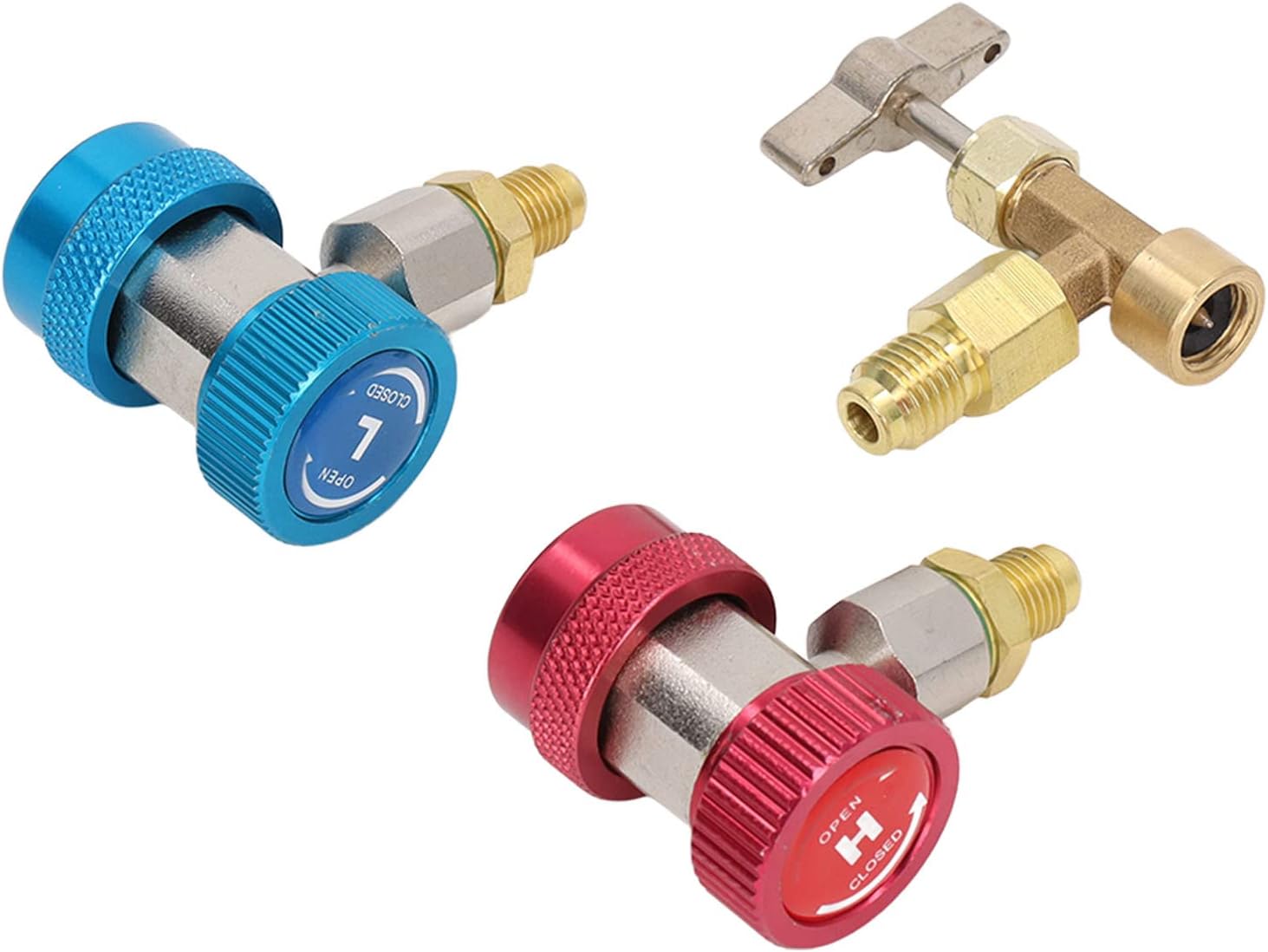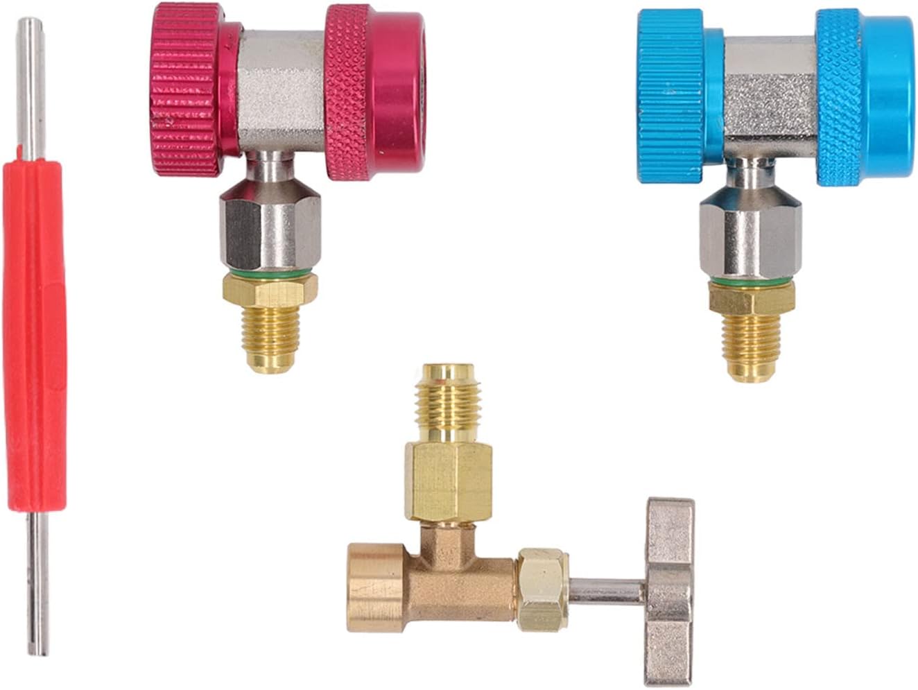 [INCLUDED TOOLS] This kit includes tank tap, quick coupler, valve core remover, and tank connectors, making it easy to install and dismantle in car air conditioning systems.[QUICK COUPLER] The R134A quick coupler features snap lock with knurled grip ring, 1/4in male connector that's compatible with most car air conditioning hoses for effortless installation.[VALVE CORE REMOVER] The double-ended valve core remover is designed for both large and small valve core pins, while the tank connectors have standard 1/4in female and 1/2 male fittings.[GOOD COMPATIBILITY] Compatible with all car , the R134A quick connector fits R134A service ports, ensuring quick and complete sealing for reliable performance.[BRASS MATERIAL] Crafted from high-quality brass material, these accessories boast high hardness, resistance, and good welding, ensuring a long service life.Spec:Item Type: R134A Adapter KitMaterial: BrassApplication: Suitable for car air conditioning systemPackage List:1 x Tank Tap2 x Quick Coupler1 x Valve Core Remover3 x Tank ConnectorNote: