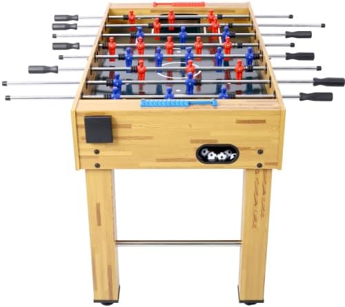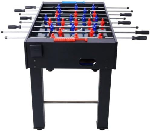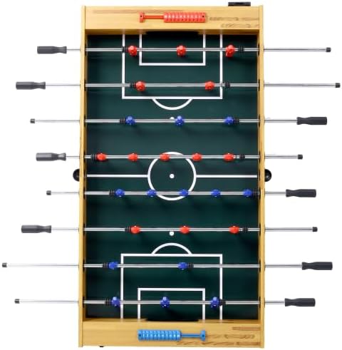 Product Features: Superior Durability: Crafted with premium, engineered wood, this high-quality table is designed to withstand rigorous gameplay. Its sturdy L-shaped legs, equipped with adjustable levelers, ensure a stable and even playing surface on any type of flooring. Professional-Grade Performance: Experience lightning-fast action with bearings that keep the game moving at a competitive pace. Ergonomic handles and solid steel rods provide a professional feel, making it a perfect addition to game rooms, gyms, or offices. Sleek and Sophisticated Design: The Hurricane boasts a stunning light-cherry finish that adds a touch of elegance to any home. Its immersive, soccer-inspired playfield puts players right in the heart of the action, enhancing the overall gaming experience. Dimensions: The playing surface measures 46-1/4" x 24-3/4" W, while the table itself has dimensions of 54" L x 27" W x 35" H, making it a versatile and space-efficient addition to any home or recreational area. illustrated description: *Table size:1370x736x876mm *Playfiled 5mm thick MDF *Rods:12.7mm chrome hollow steel bar *Handle:Non-slip rubber handles *Legs:MDF + Iron tube *Accessories :4 soccer balls 30mm,2 counter,Players ABS (1-2-5-3 Formation), 1xcup holder Product Dimensions Assembled Length (inches): 54.00 Assembled Width (inches): 29.00 Assembled Height (inches): 35.00 Product Weight (lbs): 78.00 Packaging Dimensions Length (inches): 56.50 Width (inches): 30.90 Height (inches): 6.10 Weight (lbs): 88.00
