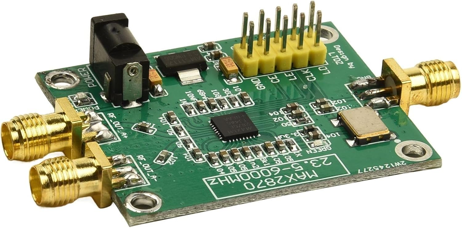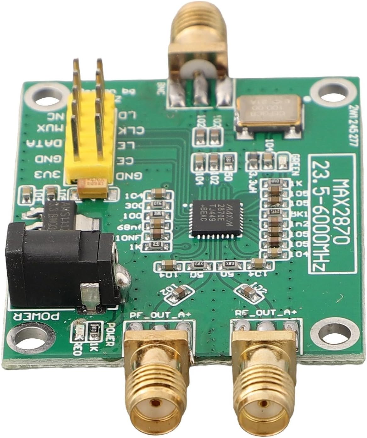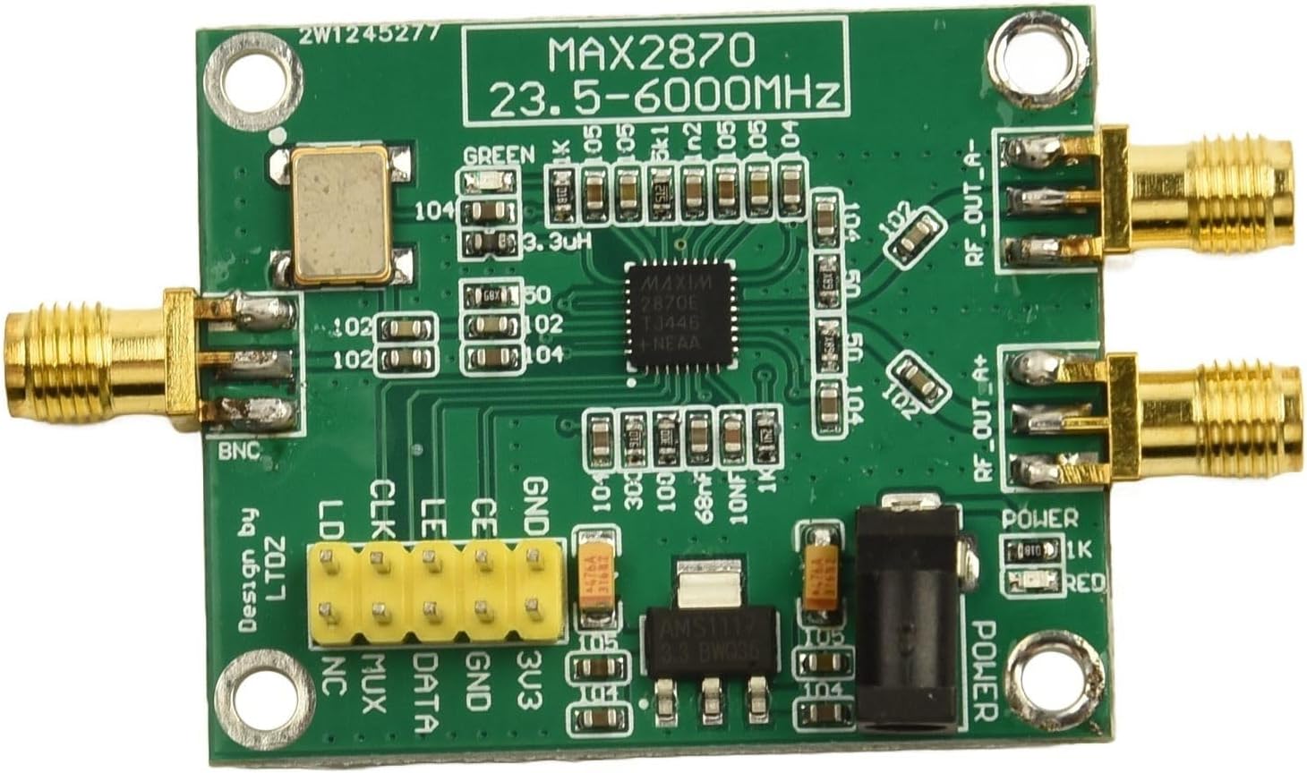 Features:* and * Made of materials, sturdy and * MAX2870 23.5-6000MHz RF signal source signal generator module PLL VCO -4dBm~+5dBm with for STM32 driver* Ultra-wideband phase-locked loop (PLL), integrated voltage-controlled oscillator (VCO).* 23.5MHz to 6.0GHz frequency range signal output.* Maintains excellent phase noise and spurious specifications.* This device offers dual-channel differential output drivers that can be individually configured to provide output power from -4dBm to +5dBm.Specification:Size: 65mm*37mm*12mmfor SPI: three-wire controlPower supply: 3.3V pin header power supply or DC 5V (onboard 3.3V voltage stabilizing IC)Onboard: 100MHz reference clock frequencyPackage Included:1 x RF signal source