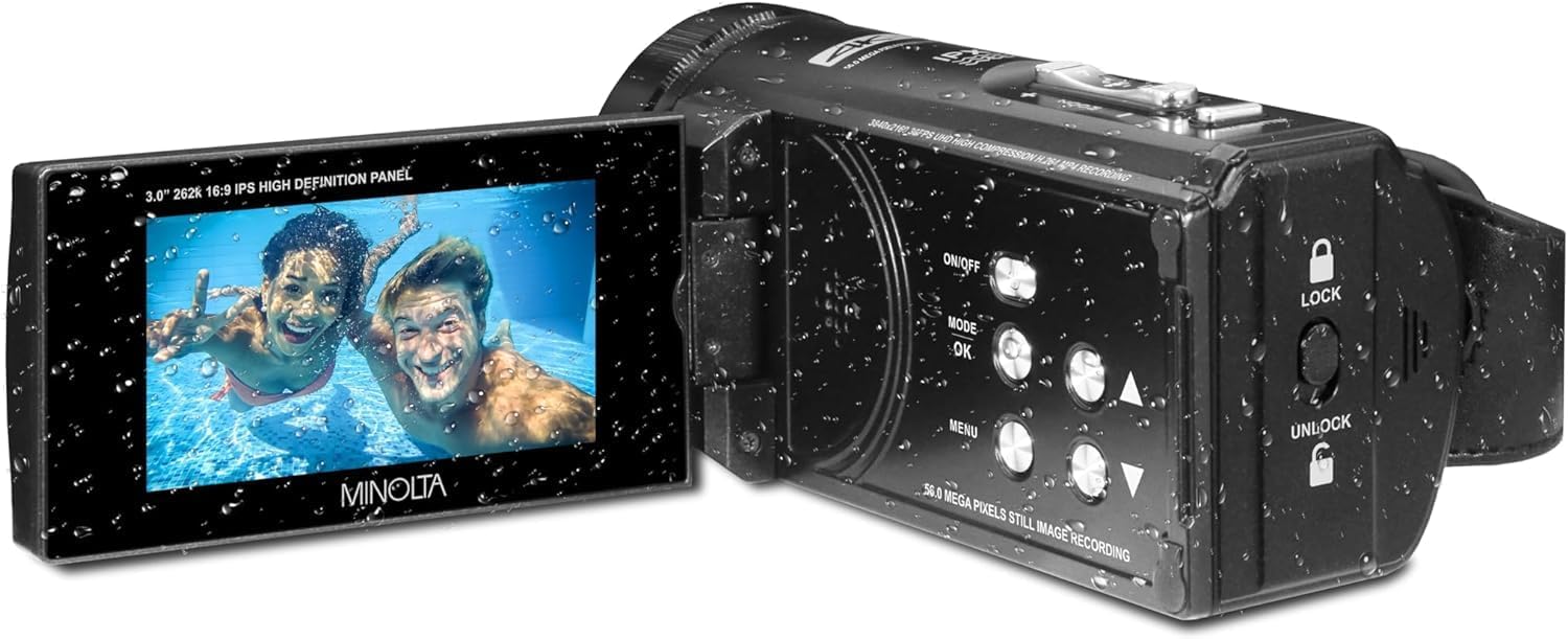 Introducing the MN4K300WP Waterproof Camcorder, your ultimate companion for capturing life's moments in stunning detail. With the ability to record in 4K Ultra HD video and snap breathtaking 56MP photos, this camcorder ensures every memory is preserved with remarkable clarity. Whether you're exploring the depths of the ocean or simply enjoying a day by the pool, its waterproof design allows you to dive in and capture mesmerizing underwater shots up to 16 feet deep. Equipped with an 18x digital zoom lens and anti-shake stabilization, the MN4K300WP lets you effortlessly zoom in on distant subjects while keeping your footage steady and smooth. The 3” IPS high-resolution LCD screen provides a crystal-clear view for easy composition and photo review, ensuring you never miss the perfect shot. But that's not all – this camcorder comes loaded with special features to enhance your shooting experience. From Time Lapse and Photo Burst to Loop Recording and Interval Photo, creativity knows no bounds. Plus, with the included 32GB MicroSD card and support for up to 128GB, you'll have ample space to store all your memories.Bundle Items Include:MINOLTA MN4K300WP 4K Ultra HD / 56 MP Waterproof Camcorder (Black)SanDisk SecureDigital Extreme PRO 128GB SDXC UHS-I Card C10,U3,V30 200MB/sTripod 72 INCHTravel BagCleaning kitMICRO HDMI CABLE TO HDMI 6 FTHAND STRAPLens Cap KeeperMemory Card WalletUSB Card Reader, SD/microSD3PC MC PRO FILTER KIT UV/CPL/F 37MMLED light