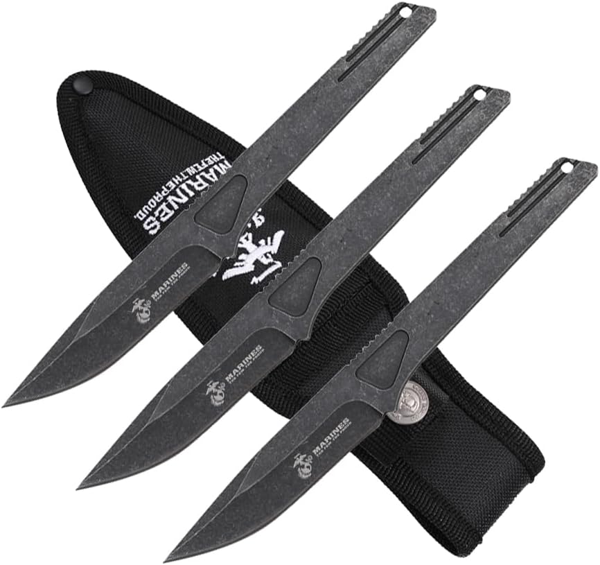 Take your knife-throwing skills to the next level with this officially licensed USMC Throwing Knife Set by MTECH USA. This set includes 3 full tang throwing knives, each measuring 7.50" overall with a 3.00" stonewashed stainless steel blade and a 4.50" stainless steel handle finished in a striking black and satin silver color combination. The full tang construction ensures superior balance and durability, making these knives ideal for recreational throwing, martial arts training, and target practice. Whether you're a seasoned thrower or just getting started, the well-balanced design delivers consistent performance with every throw. The knives come with a nylon sheath for safe and convenient storage and transport. Suitable for unisex adults, this set also makes a great collectible or gift for fans of military gear, tactical equipment, and outdoor sports. The package weighs just 12 ounces, making it easy to carry to your next session. A 30-day warranty is included for added peace of mind.