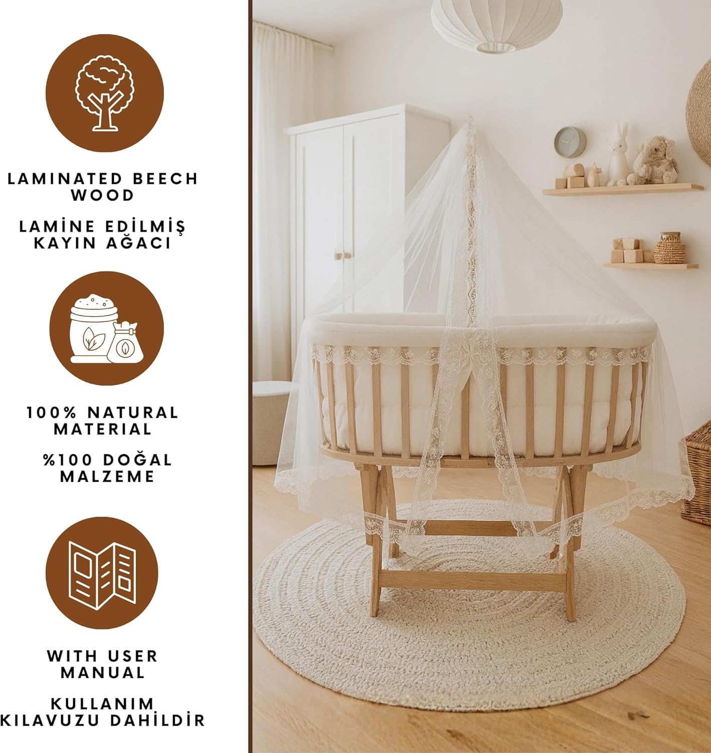 Natural Beech Wood Canopy Cradle with Cream French Lace Textile Set, Rocking & Locking Design, Complete Set with Mattress, Bedding, Pillow and Mosquito Net