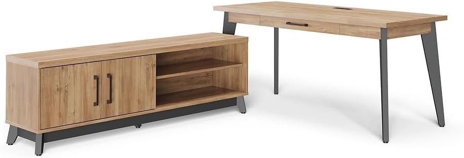 Transform your office with the NBF Writing Desk and Low Credenza Set, featuring a contemporary Monarca brown finish and sleek black base for modern appeal. This adjustable rectangular desk delivers an expansive 98" x 65" work surface—ideal for multitasking professionals who need space for dual monitors, paperwork, or creative projects. Stay organized with built-in drawers, cabinets, open shelving compartments, and integrated USB outlets to keep essentials within reach yet neatly tucked away. The matching low credenza provides additional storage behind sliding doors while maintaining a cohesive look in any commercial workspace. Designed specifically for interior offices from durable materials (NBF Signature Series), this set boasts solid construction and stable frame support that stands up to daily use; includes warranty coverage plus easy-to-follow assembly instructions so you can create a clutter-free professional environment quickly.