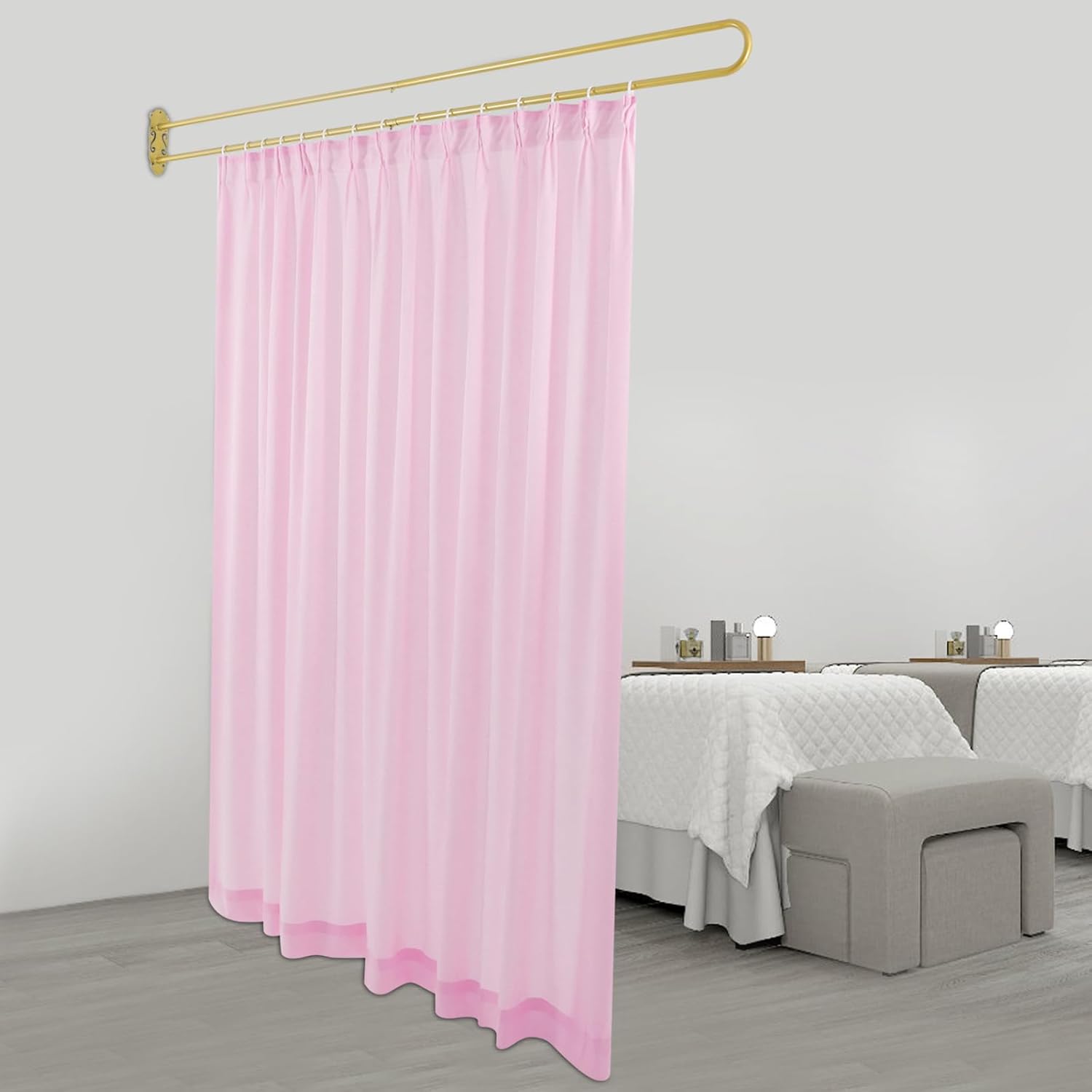 Product Description:Whether it's an open-plan work area or a cozy corner of your home, this beautifully designed divider curtain cleverly divides your space while maintaining an overall airy feel. It features a soft, comfortable curtain and strong, sturdy support with simple, pastel colors, making every pull open and close an enjoyable life aesthetic.Details:Gliding Rings: They allow you to hang the curtain with ease and flexibly glide for quick closing and opening.Smooth Edges: They are smooth to the touch and can protect your hands from getting scratched during installation and daily use.Storage Cord: It can be used to bundle and organize curtains, providing you with a neat and tidy space.Application:The product is suitable for offices, conference rooms, beauty salons, patio glass doors, bedrooms, living rooms, bars, hospitals, laboratories, SPAs, student dormitories, and other places.Specifications:Color: Gold+Pink/Gold+Light Yellow/Gold+WhiteMaterial: Iron, PolyesterProcess: Baking PaintMount Type: Wall MountedAssembly Required: YesIs Dishwasher Safe: NoU-shaped Bracket Size(L*W): 200*22cm/78.7*8.7inPackage Size: 110*22*10cm/43.31*8.66*3.94inGross Weight: 3kg/6.61lbsNet Weight: 2.5kg/5.51lbsPackage Included:1* U-shaped Bracket1* Curtain1* English ManualOther Needed AccessoriesNotes:1. Please check the size carefully before ordering.2. Please allow the slight color difference caused by the shooting light and 1-3cm error due to manual measurement, and make sure you do not mind before you order.