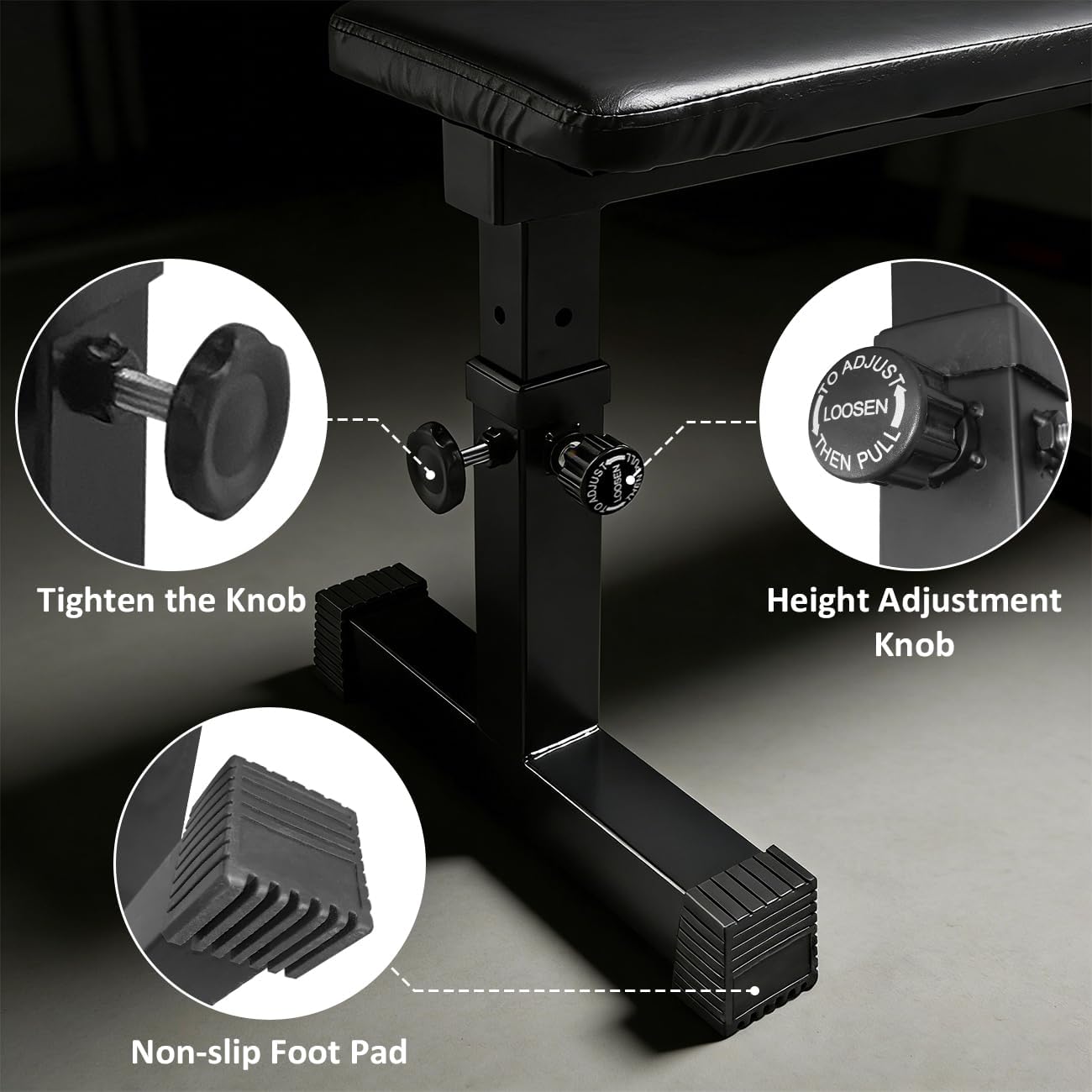 "Product Description Height Adjustable Utility Flat Weight Bench – 300 lbs Capacity | For Strength Training & Ab Exercises, Black Transform your home gym into a personal strength-training hub with our Height Adjustable Utility Flat Weight Bench. Designed for versatility and durability, this bench is the perfect addition to any workout routine—whether you’re crushing bench presses, core-focused ab exercises, or full-body strength sessions. Built to support up to 300 lbs of weight, it’s engineered to keep up with your fitness goals, from beginner lifts to advanced powerbuilding. ✨ Key Features & Benefits Customizable Height Adjustment: Easily adjust the bench height between 15” and 21” using the secure twist-lock knobs. Heavy-Duty 300 lbs Weight Capacity: Crafted from thick, high-strength square steel tubing, this bench delivers exceptional stability and structural integrity. It’s rigorously load-tested to support up to 300 lbs, making it suitable for dumbbell presses, barbell lifts, and weighted core work—no wobble, no compromise. Ultra-Stable Non-Slip Base: The wide H-frame base and textured non-slip foot pads ensure the bench stays firmly anchored to your floor, even during intense, explosive movements. Protect your floors from scuffs while maintaining maximum stability for safe, confident lifting. The material is easy to wipe clean, resisting odors and wear to keep your bench looking and performing like new for years. Comfortable, Durable Padding: The 2-inch thick padded top is wrapped in premium, sweat-resistant faux leather, providing a firm yet comfortable surface for extended workouts. Space-Saving, Versatile Design: At 43” long and 16.8” wide, this flat bench fits seamlessly into small home gyms, garages, or apartment spaces. It’s the ultimate multi-purpose tool for strength training, ab workouts, push-ups, dumbbell rows, and more—eliminating the need for multiple bulky gym machines. 🛡️ Why Choose Our Adjustable Weight Bench? American Home Gym Ready: Designed to meet the needs of US fitness enthusiasts, this bench is compatible with standard dumbbells, barbells, and weight plates, making it a universal fit for any home gym setup. Quick & Easy Assembly: All necessary hardware and clear instructions are included, so you can assemble your bench in under 30 minutes and start lifting right away. Sleek, Professional Look: The matte black finish and minimalist design blend effortlessly with any decor, from modern home gyms to traditional workout spaces. 📏 Product Specifications Weight Capacity: 300 lbs (tested for real-world use) Adjustable Height Range: 15” – 21” Overall Dimensions: 43” (L) x 16.8” (W) x 15”–21” (H) Frame Material: High-strength square steel tubing Padding Material: Faux leather-covered foam (2” thickness) Color: Black 💪 Perfect For These Workouts Flat bench presses (barbell / dumbbell) Incline/decline variations (via height adjustment) Ab crunches, leg raises, and core training Seated shoulder presses and tricep dips Dumbbell rows, chest flyes, and full-body strength circuits"