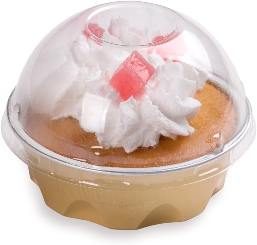 Display your decorated desserts for takeaways with our Pastry Tek 1.7 ounce Round Gold Aluminum Baking Cups. These baking cups come with dome-shaped lids that fulfill a variety of your baking needs and also help preserve the decoration of the desserts for takeaway orders. Ready for baking cakes and muffins in ovens, these muffin tins are a must-have for both amateur and professional bakers. An ideal choice for patisseries, cafes, bakeries, or home bakers, these mini muffin tins are freezable so you can relish your leftover desserts. These mini cake pans are disposable for easy cleaning. With a classic gold finish, these mini aluminum cake cups will enhance the appearance of any dessert. Containing up to 2 ounces, each mini cake pan with lids measures 2.8 inches in diameter by 1 inch in height. Sold in a 100 count box.