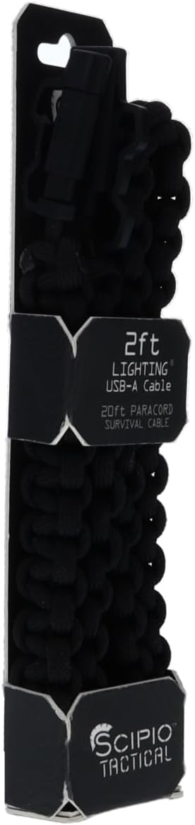 Enjoy high-speed charging and data transfer. This 2-ft charger includes an easily removable 6-ft paracord for emergency survival situations and provides a quick charge. It is also tangle free to help lower the likelihood of your power cord fraying with age. This is a USB-A to Lightning charging cord that comes with each port capped to keep out dirt and moisture. The protective paracord around the syncing cable can be unraveled if rope is needed in an emergency situation. This Lightning cable is compatible with Apple devices. A hook-and-loop fastener comes with it so you can keep it stored and compact when not in use.