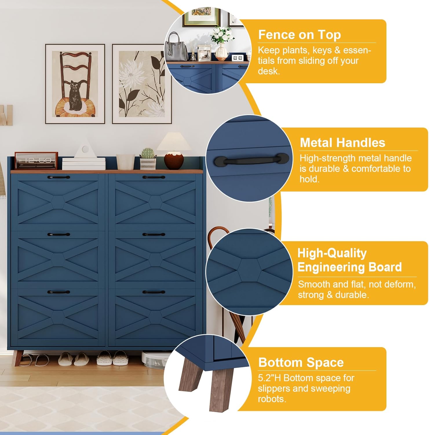 | Storage Options | Flip-up drawers with dual-layer storage |