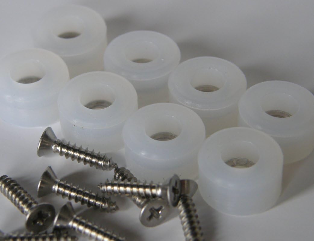 Silicone rubber is soft but durable material. Heat resistant up to 500 degrees. UV and oil resistant. Non-marring and non-toxic. The small 1/2" DIA bumpers are 1/4" tall and have stainless steel washers embedded for maximum holding power. The extra small 3/8" DIA bumpers are 3/16" tall and do not have washers. Each package comes with stainless steel screws (see photos)