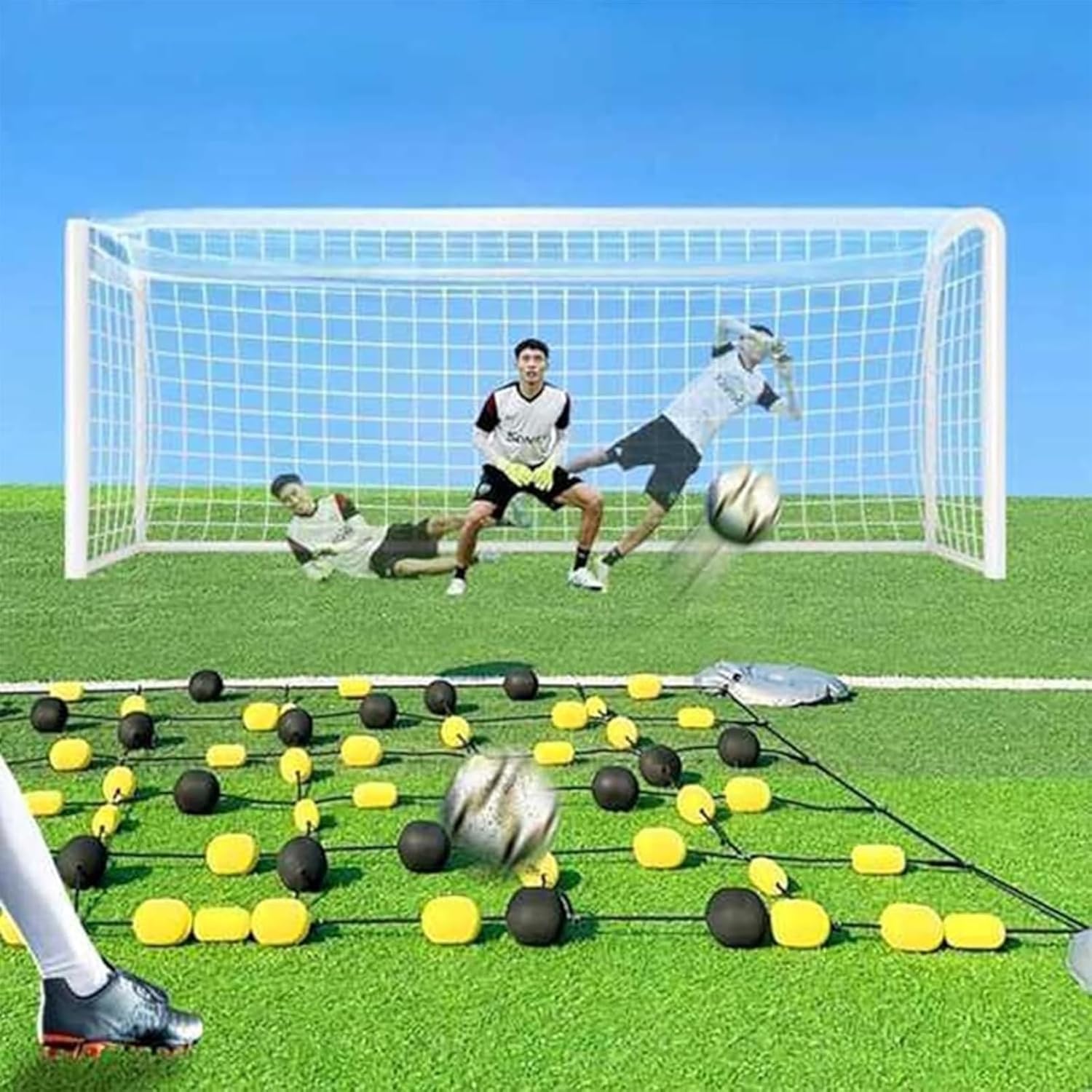 key features & advantages❤ multi-angle deflection:low ball, half high ball, high ball, refraction ball etc realistic drills.❤ solid construction: high-density material resists weather, kicks❤portable design: lightweight, foldable, and easy to assemble (no tools required).❤ 2 size options: 2.8x2m or 2x1.6m.mimics real-game unpredictability.❤ pro-endorsed: upgraded based on feedback from elite goalkeepers and coaches.❤adaptable to all skill levels (beginners to pros). applicable people perfect for solo drills or team coaching sessions.builds muscle memory for fast, instinctive saves.for goalkeepers aged 12+ (youth leagues to professionals). specifications name:goalkeeper rebound chainsizes:2.8m*2m/2m*1.6mweight:3.1kgmaterial:evadiameter of hole:10mmapplicable goals:futsal/seven-a-side soccer goal package training rebound chain*1water bag (without water) *4elastic rope*4u-shaped nail*4organizer bag*1