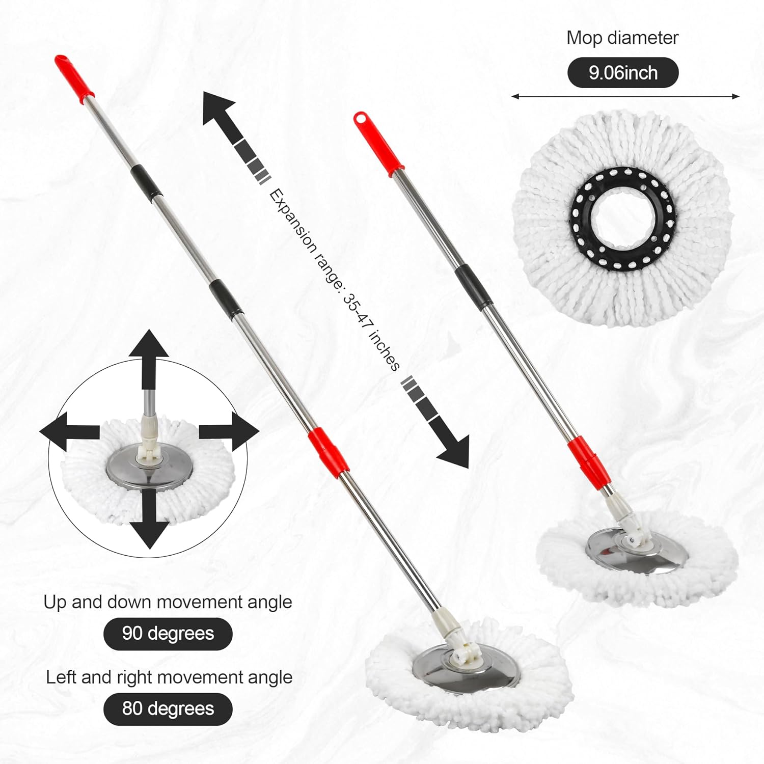 Transform your cleaning routine with this innovative spin mop system featuring a 360° rotating mop head and an adjustable handle that extends from 39 to 61 inches to suit users of different heights. The 20-quart bucket comes equipped with an auto-clean feature and built-in wringer system for efficient cleaning and hands-free wringing. The set includes three microfiber mop heads that effectively capture dirt and debris. The thoughtfully designed bucket measures 17.7 x 10.2 x 8.2 inches, providing ample capacity while remaining compact enough for easy storage. The cordless electric mop feature allows for unrestricted movement, while the water spray function helps tackle stubborn stains. Perfect for all types of floors, this comprehensive cleaning system combines convenience with powerful performance. The sturdy 13-inch mop head ensures thorough coverage, making quick work of your cleaning tasks.