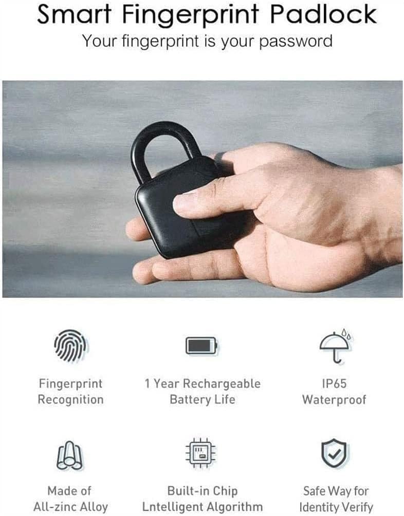 Specifications:Product name: Fingerprint PadlockColor: BlackMaterial: Zinc alloySize: 8.9*5.8*2.5cm/ 3.5*2.3*1.0inBattery: 3.7V 300mAh Resolution: 508DPIStandby time: 1 YearsWaterproof: IP65Working Temperature: -20℃~70℃Weight: 188g/ 6.6ozThank you for your support, we will strive to do better. If you have any questions, please contact us in time, we will reply to you within 24 hours