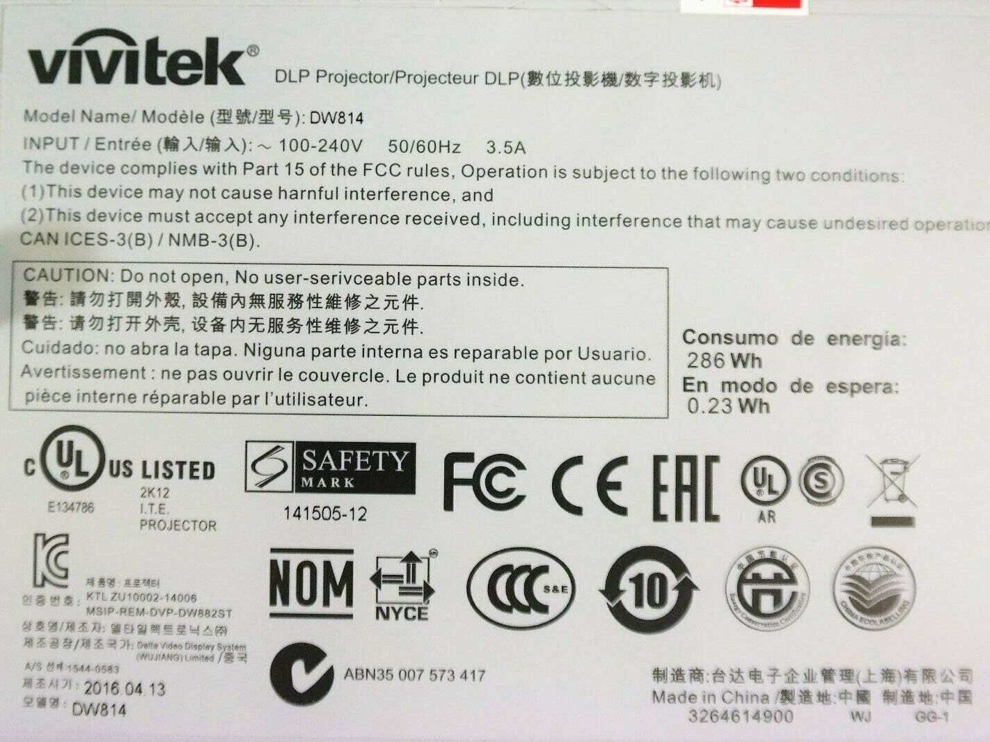 The Vivitek DW814 Projector is a WXGA Conference Room Projector. This lamp based projector is capable of displaying 3,800 Lumens at its brightest setting with a native resolution of 1280x800 , and is 3D capable. The internal DLP technology touts higher contrast, less visible pixels and more portability.