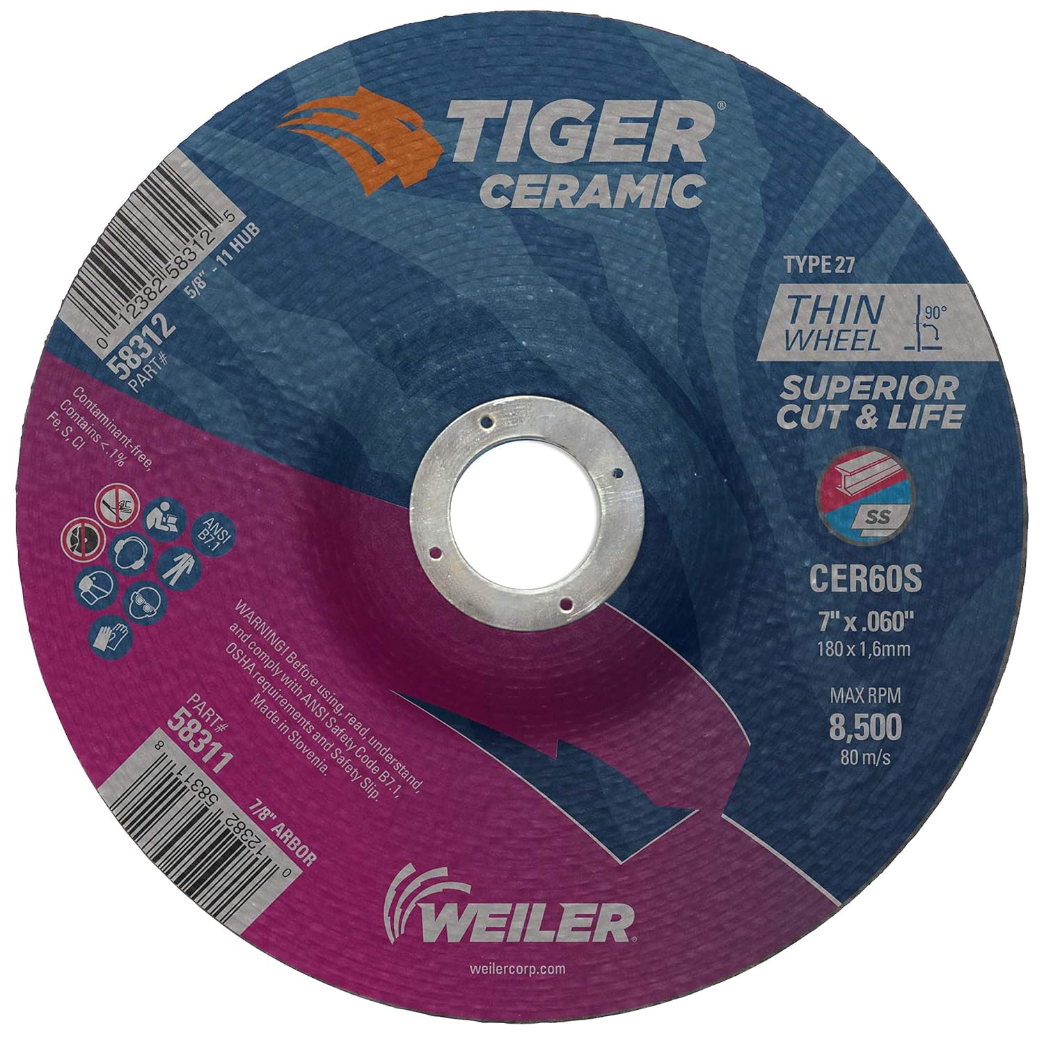 Weiler Wolverine 7 inch type 27 depressed center cutting wheels deliver a fast cut rate and consistent performance at a good value when cutting steel and other metals. The depressed center provides added clearance when working at a constrained angle and .060" thickness is ideal for cutting tubes, bar stock, and large cross-sections with a right angle grinder. The 7/8" open arbor offers a cost-effective mounting option when using adapting nuts.
