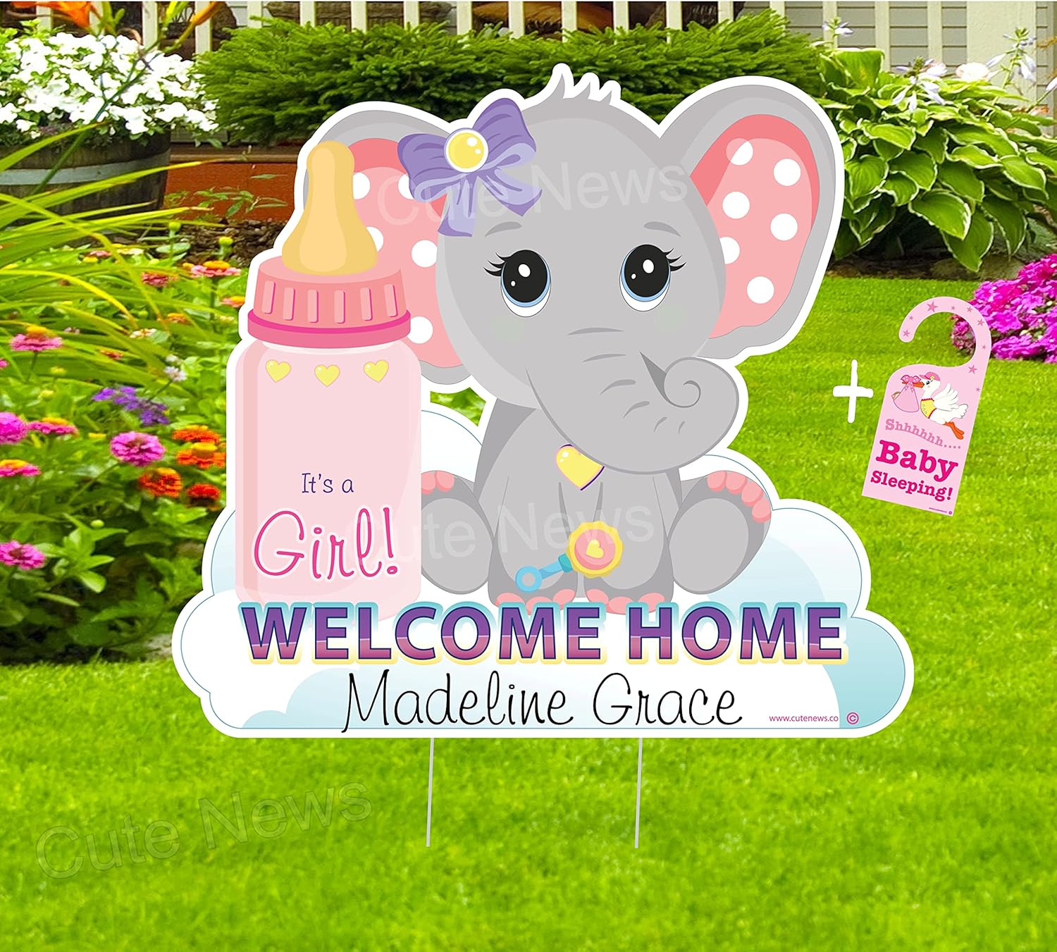 Welcome mom and the newborn baby girl home with this personalized special delivery lawn baby elephant yard sign. This new baby arrival decoration can read baby's first and middle name. There is nothing happier than the birth of a new baby! Our newborn greeting announcement signs also make a perfect baby shower party yard art decoration.