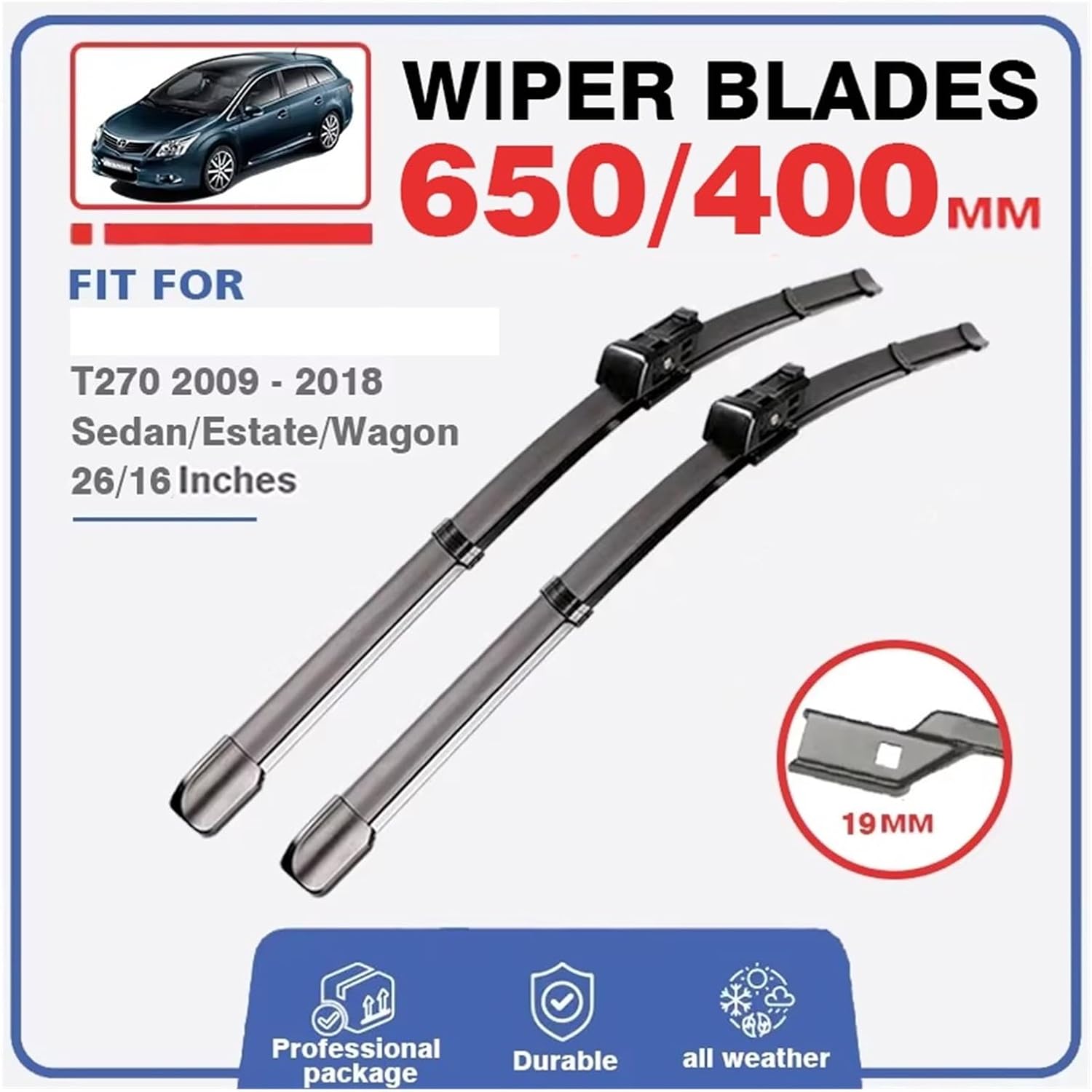 Wiper Blades Avensis T27 MK3 2009 2010 2011 2012 2013 2014 2015 2016 2017 2018 Front Wiper Car Windshield Windows Cutter Windscreen Brushes HatchbackHign-concerned : NonePlacement : FRONTYear : 2009,2010,2011,2012,2013,2018,2014year,2015year,2016year,2017YearSpecial Features : Cleaning windshieldItem Weight : 0.35kgItem Height : 2inchItem Width : 2inchExternal Testing Certification : Model Name : 261612NO. : 111Type : Push ButtonWiper : Flat Wiper Blades,Wiper Cutter,Wiper Brushes,Wiper Blade,Windshield,Windscreenyear : 2009 2010 2011 2012 2013 2014 2015 2016 2017 2018Model : Avensis wiper, avensis wiper blade, avensis t27 windshield wiper, avensis t27 wiper, car windshield wiper avensis, wiper blade avensis hatchback