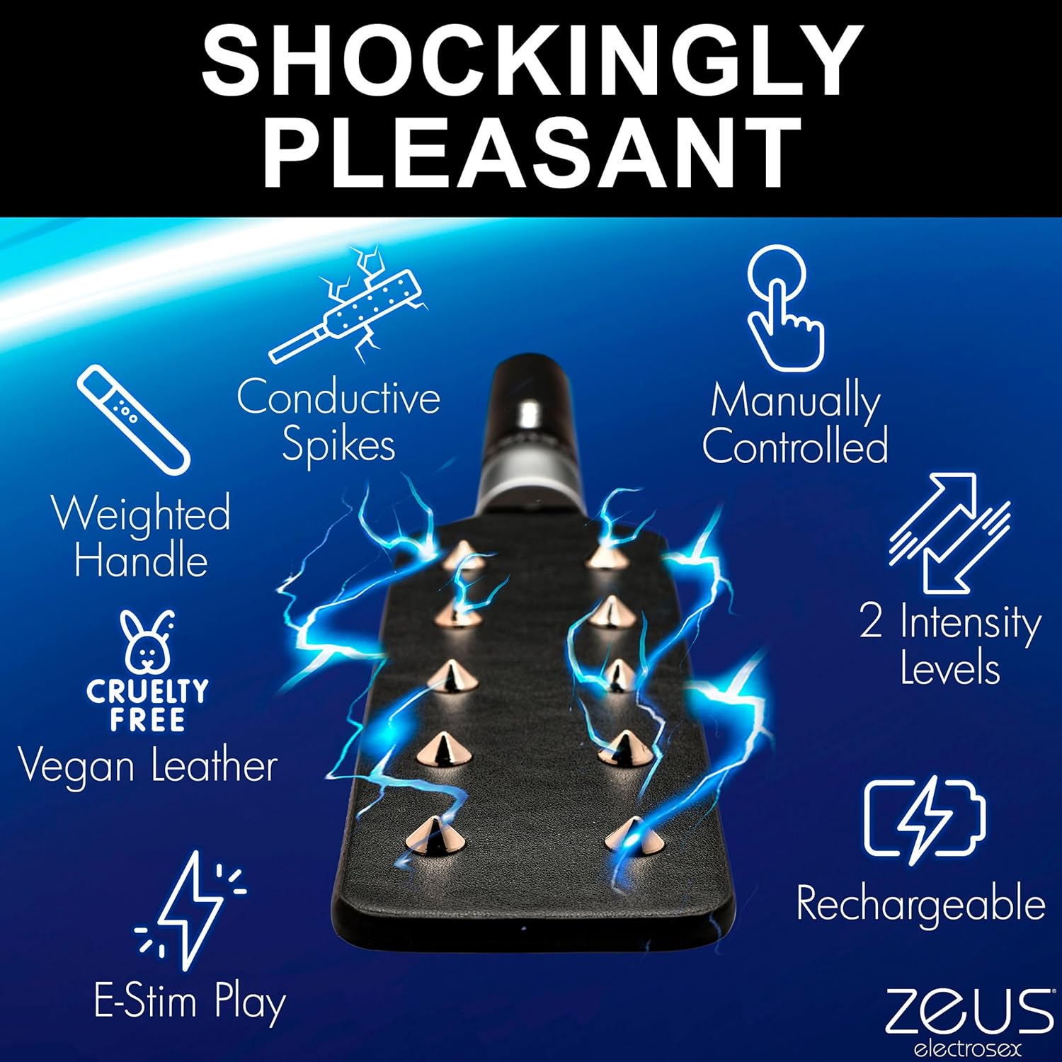 Add some bite to your spanking sessions with this E-stim Spiked Paddle! It has 10 spikes on one side that will bite into your partner's juicy flesh like little teeth. They won't break the skin, but they will leave a memorable sensation. Flip it over to the flat side and rub their behind to cool them down. Then amp up the intensity again by turning on the electrostimulation! Choose between two different intensities and enjoy as they get shocked by the conductive spikes! The paddle is covered in vegan-friendly, vegan leather and the metal is made out of nickel-free, zinc alloy. The e-stim paddle is rechargeable. Simply use the USB cable provided. Keep away from water.Note: Keep away from water. Not recommended to use e-stim products on the chest or with partners who have pacemakers.